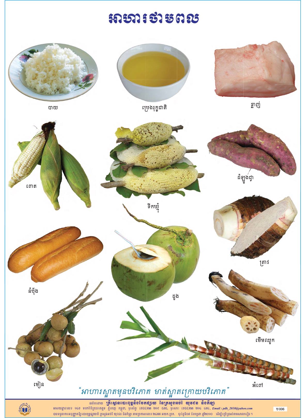 ៣. អាហារការពាររាងកាយពីជម្ងឺ៖ មានដូចជា បន្លែ និងរុក្ខជាតិណាដែលមានពណ៌បៃតងចាស់ (ស្លឹកបាស ផ្ទី ត្រកួន ស្ពៃ កញ្ឆែត។ល។) និងបន្លែផ្លែឈើដែលមានពណ៌ លឿងទុំ (ល្ពៅ ស្វាយទុំ ល្ហុង ។ល។) ។