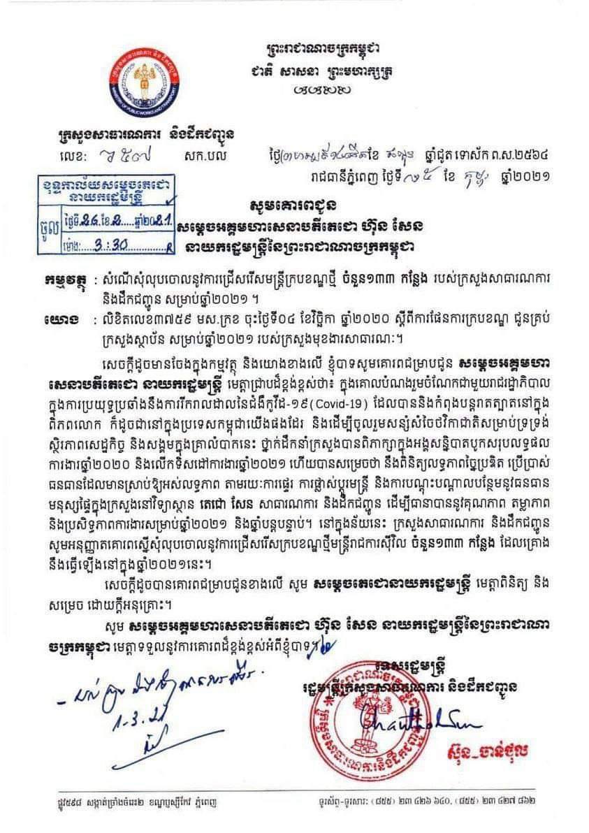 (ភ្នំពេញ)៖ ក្រសួងសាធារណការ និងដឹកជញ្ជូន បានស្នើ និងទទួលបានគោលការណ៍ឯកភាពពីសម្តេចតេជោ ហ៊ិន សែន ប្រមុខរាជរដ្ឋាភិបាលកម្ពុជា ដោយលុបចោលការជ្រើសរើសមន្ត្រីក្របខណ្ឌថ្មី ចំនួន១៣៣កន្លែង សម្រាប់ឆ្នាំ២០២១។
