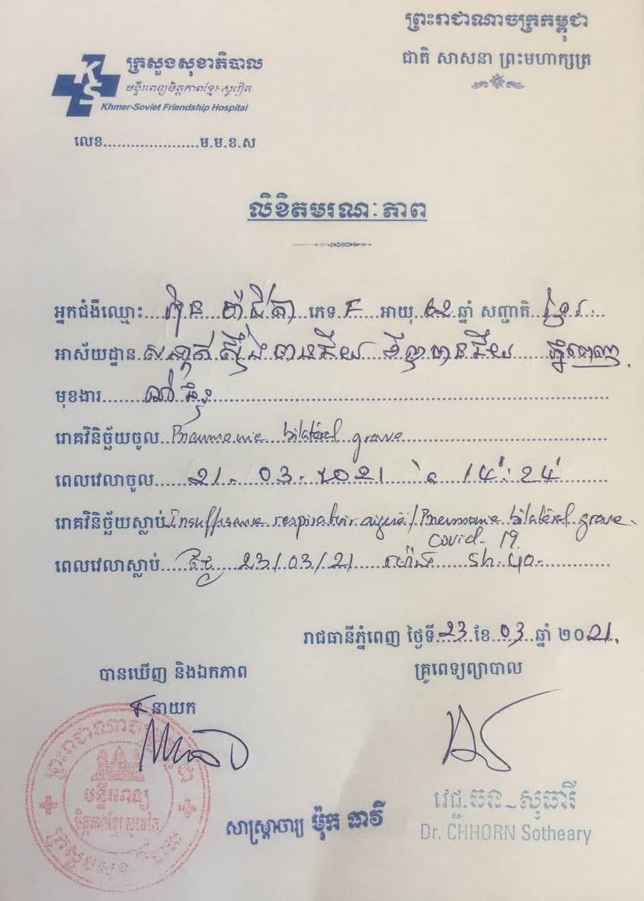សូមបញ្ជាក់ដែរថាអ្នកជំងឺដែលបានបាត់បង់ជីវិតនេះមានឈ្មោះ អុិន ម៉ានីតាភេទស្រី អាយុ៦២ឆ្នាំ រស់នៅក្រោយផ្សារសឡា ភូមិមានជ័យ ខណ្ឌមានជ័យ រាជធានីភ្នំពេញ ដែលត្រូវបានរកឃើញមានផ្ទុកជំងឺកូវីដ-១៩ កាលពីថ្ងៃទី២០ ខែមីនា ឆ្នាំ២០២១និងត្រូវបានដឹកបញ្ជូនទៅសម្រាកព្យាបាលនៅមន្ទីរពេទ្យមិត្តភាពខ្មែរ-សូវៀតភ្លាមៗក្រោយពីអាការៈអ្នកស្រីអុិន ម៉ានីតាមានសភាពធ្ងន់ធ្ងរនោះ៕