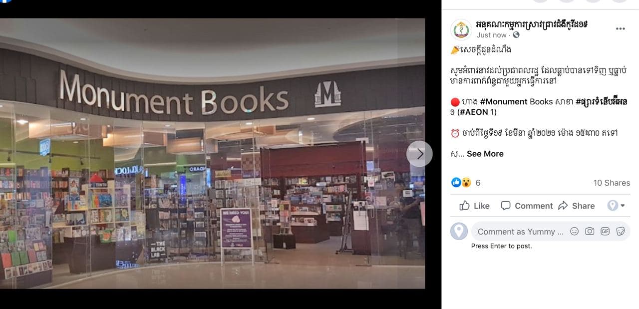 (ភ្នំពេញ)៖ យោងតាមសេចក្ដីប្រកាសរបស់អនុគណះកម្មការស្រាវជ្រាវជំងឺកូវីដ១៩ាវនាវដល់ប្រជាពលរដ្ឋ ដែលធ្លាប់បានទៅ ឬធ្លាប់មានការពាក់ព័ន្ធជាមួយអ្នកធ្វើការនៅហាង Monument Books សាខា ផ្សារទំនើបអ៊ីអន ១ (AEON 1) ចាប់ពីថ្ងៃទី១៩ ខែមីនា ឆ្នាំ២០២១ ម៉ោង ១៥៖៣០ តទៅសូមដាក់ខ្លួនឲ្យនៅដាច់ដោយឡែក ឬប្រសិនបើមានអាការៈមិនស្រួលខ្លួន ឬសង្ស័យ សូមមេត្តាប្រញាប់ ទៅធ្វេីតេស្តរកមេរោគ កូវីដ១៩ (#COVID-19)