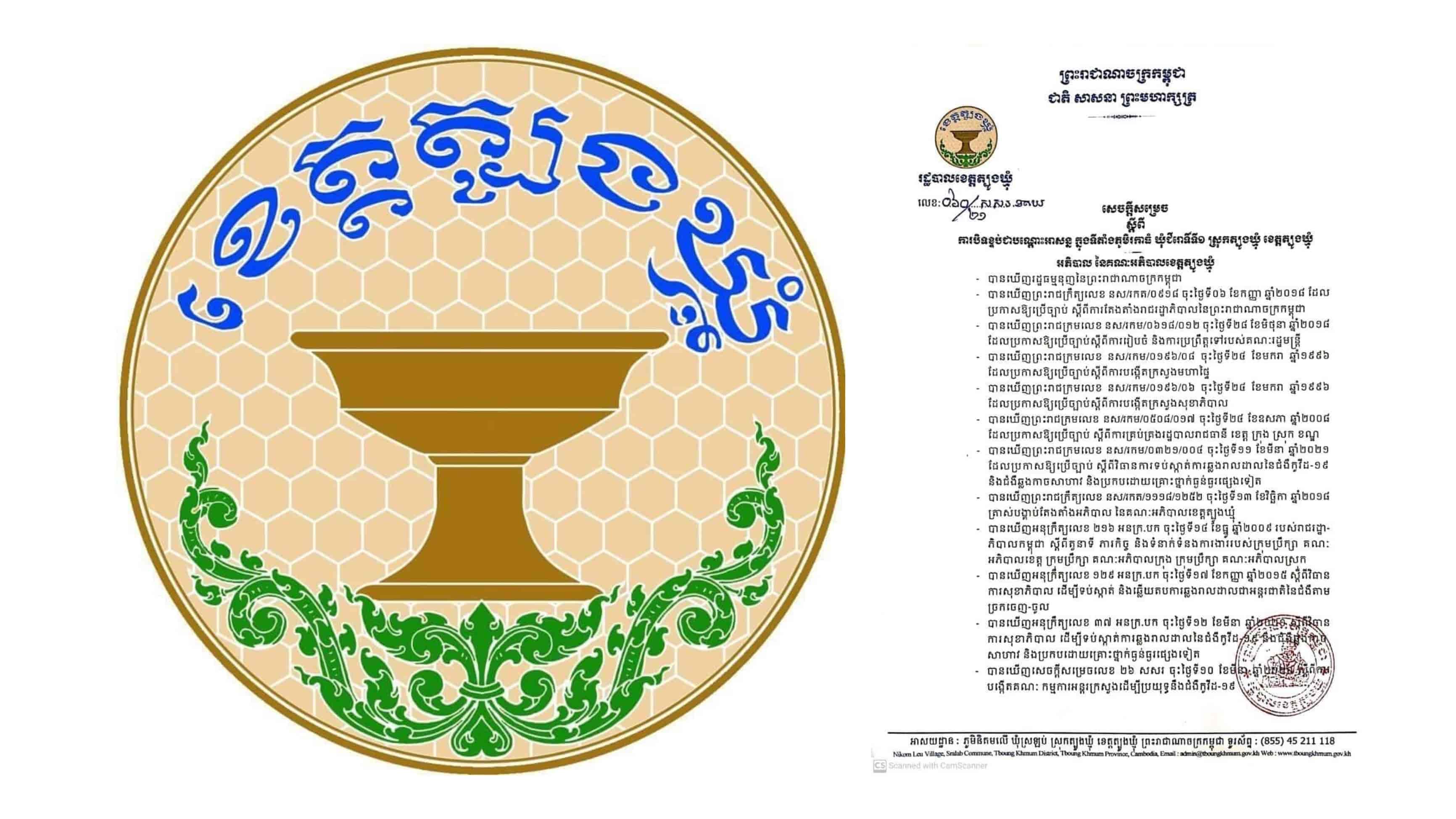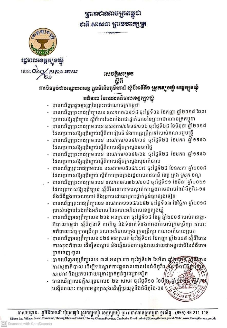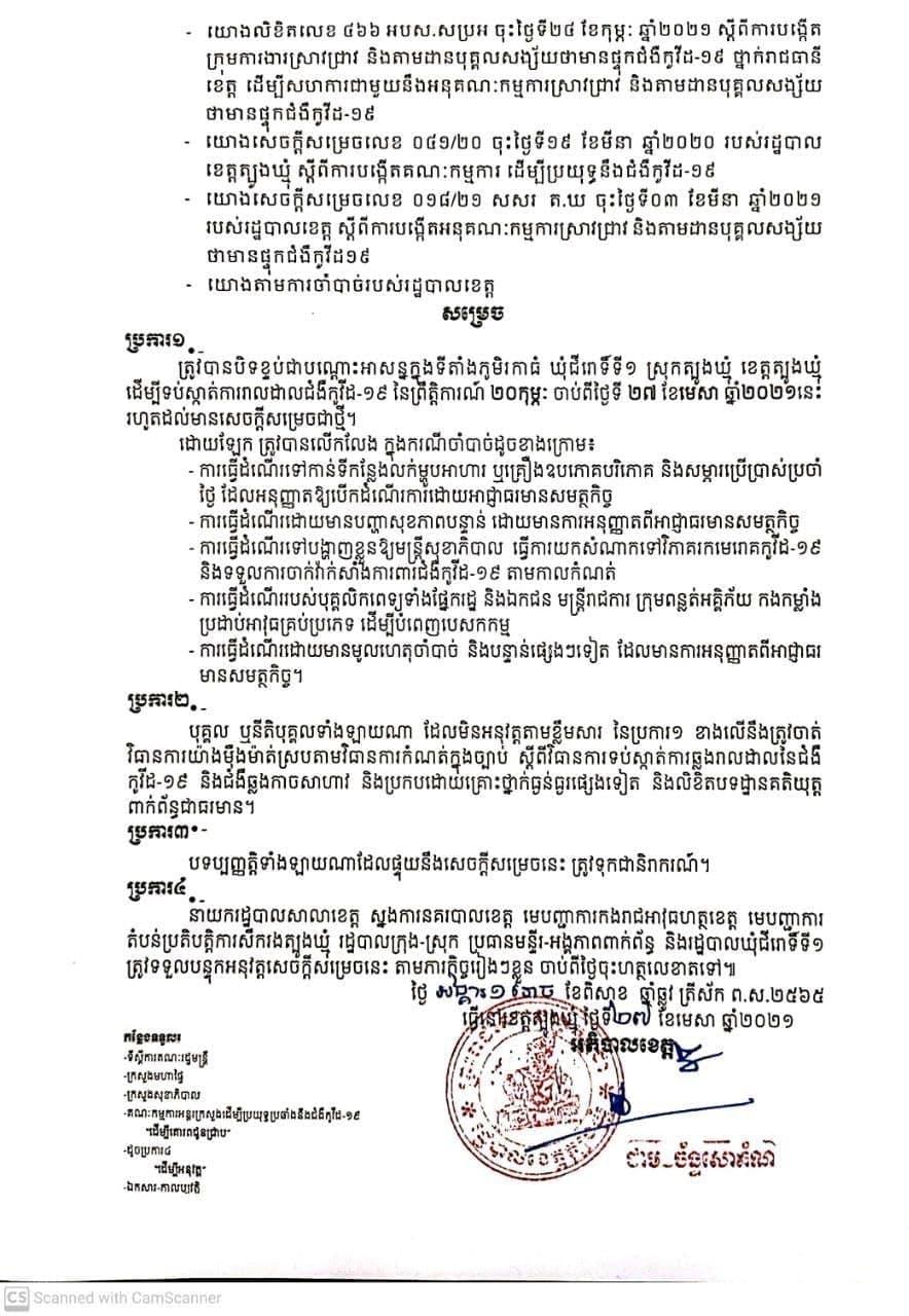 (ត្បូងឃ្មុំ)៖ រដ្ឋបាលខេត្តត្បូងឃ្មុំ នាថ្ងៃទី២៧ ខែមេសា ឆ្នាំ២០២១នេះ បានចេញសេចក្តីសម្រេច ស្តីពីការរ បិទខ្ទប់ជាបណ្តោះអាសន្នក្នុងភូមិសាស្ត្រភូមិរកាធំ ឃុំជីរោទិ៍ទី១ ស្រុកត្បូងឃ្មុំ រហូតដល់មានការជូនដំណឹងជាថ្មី។