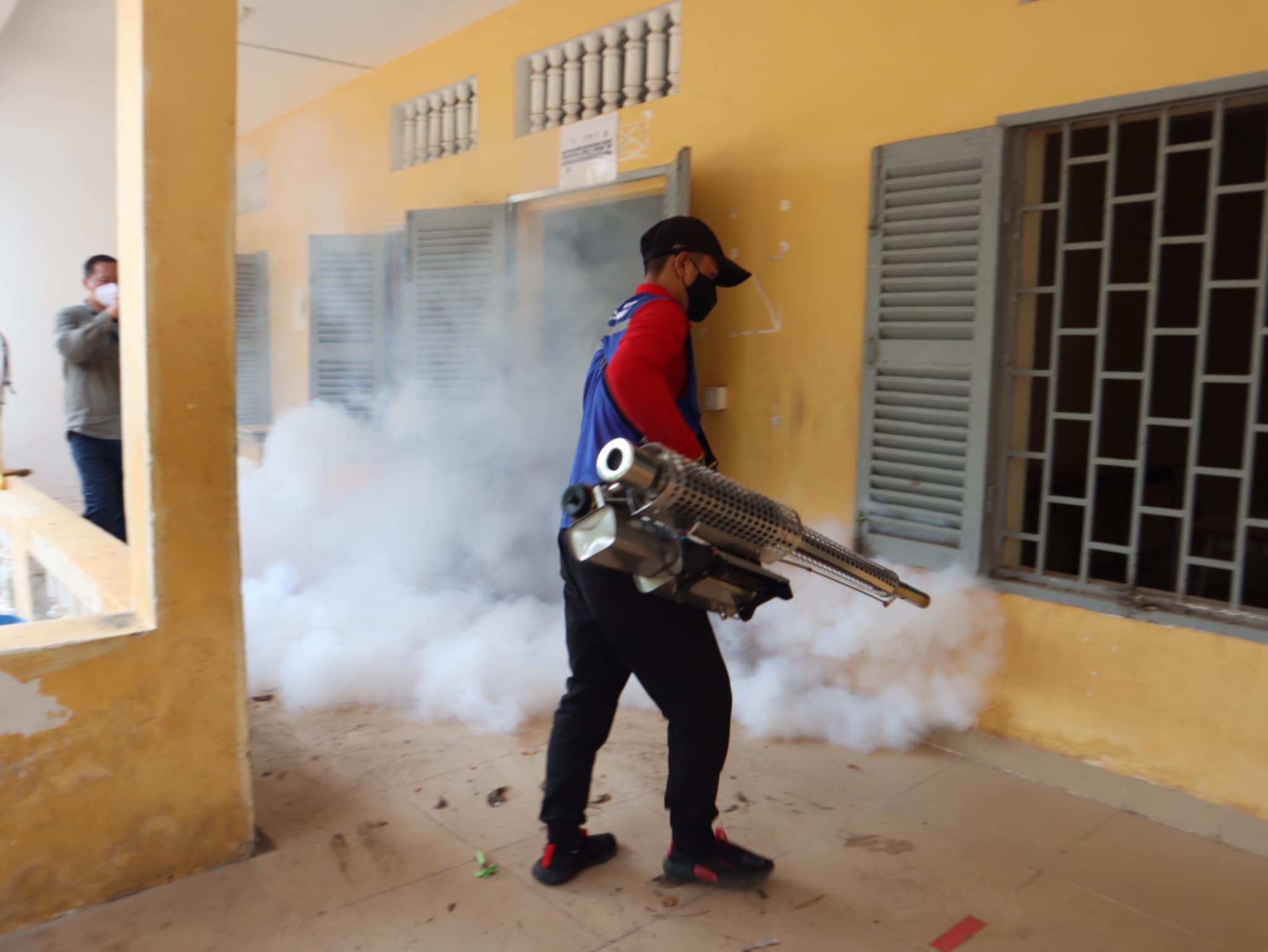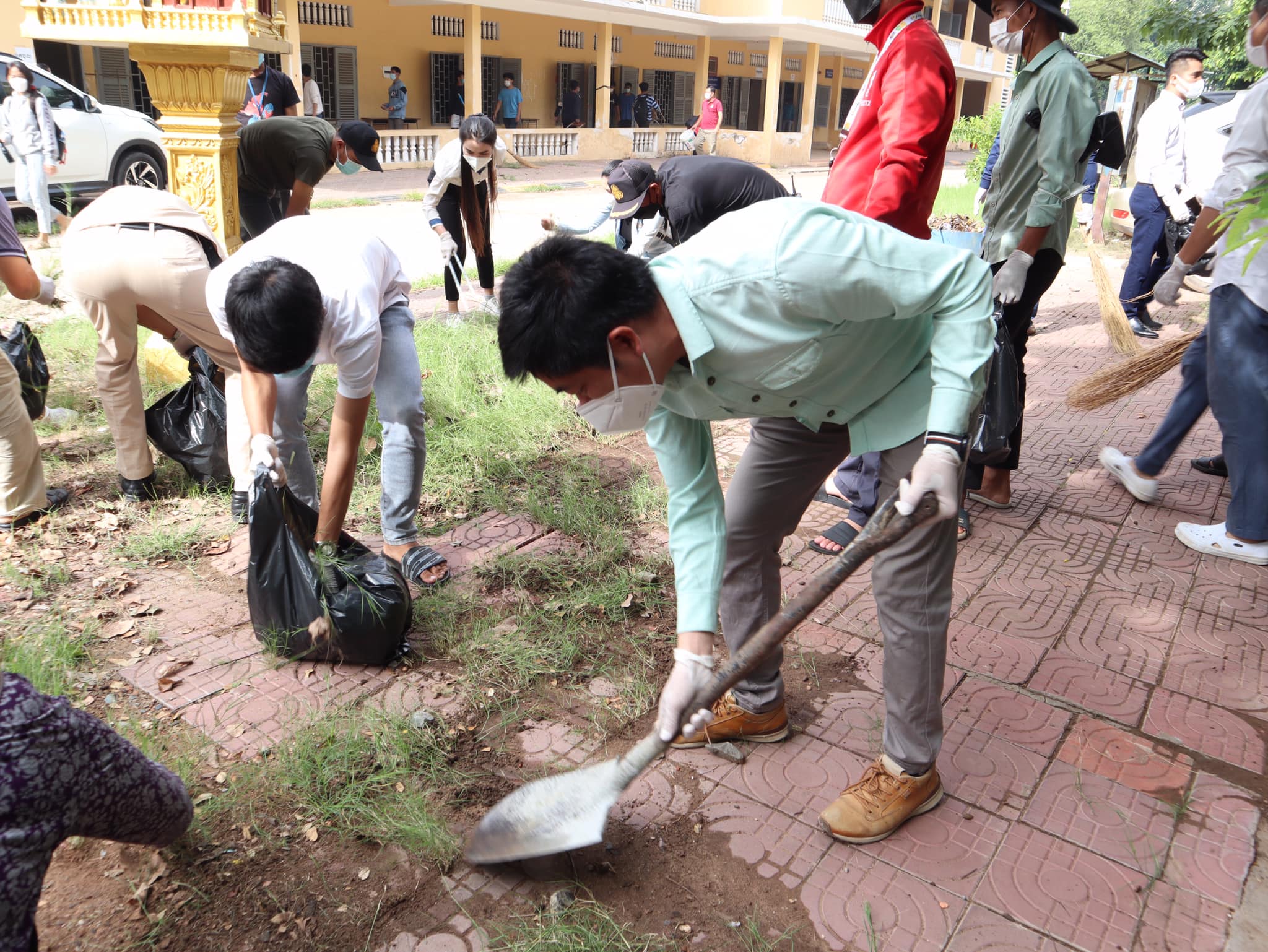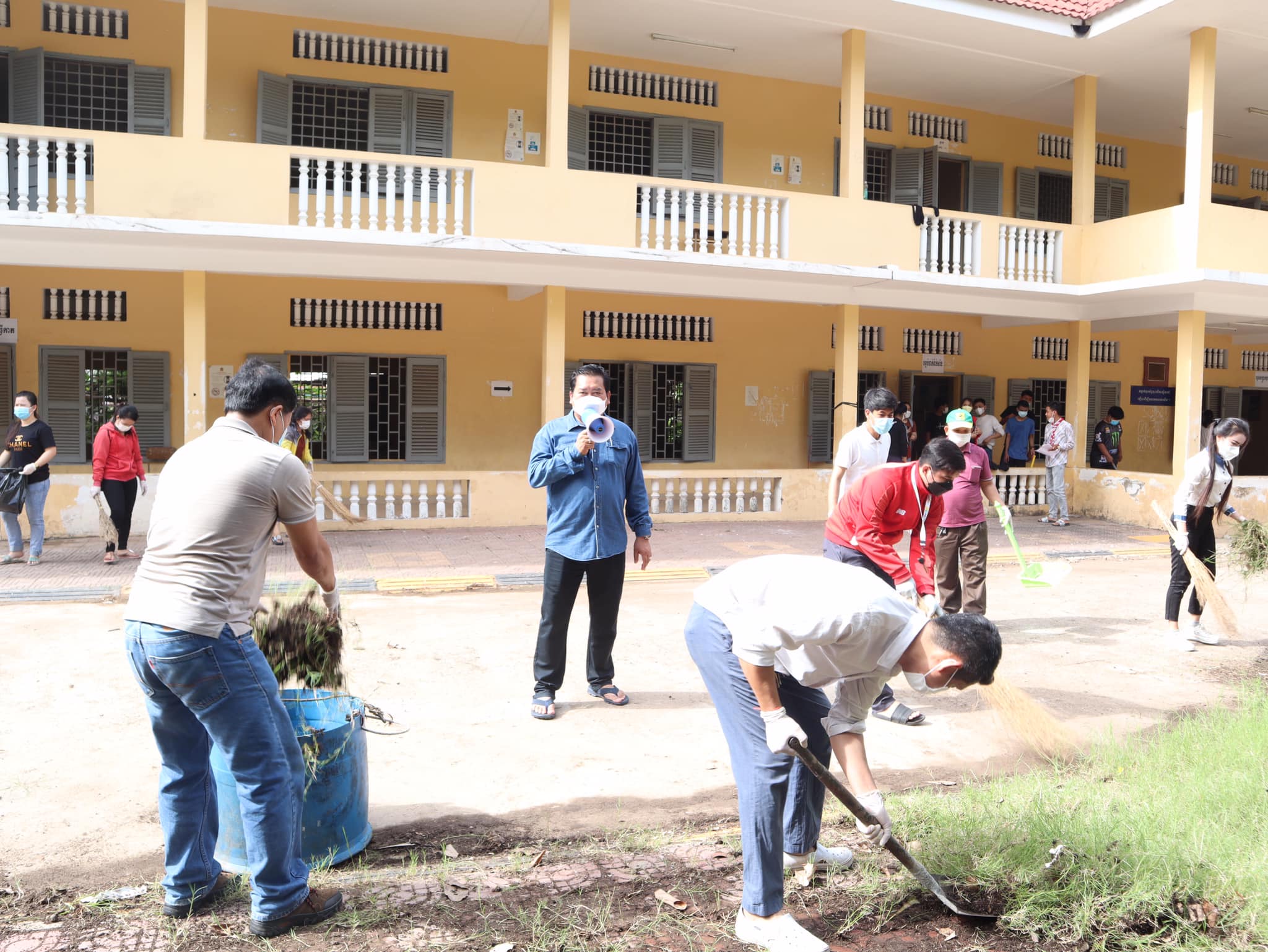 (រាជធានីភ្នំពេញ)៖ នៅព្រឹកថ្ងៃសៅរ៍ថ្ងៃទី០៤ ខែកញ្ញា ឆ្នាំ២០២១នេះ លោកធឹម សំអាន អភិបាលនៃគណៈអភិបាលខណ្ឌបឹងកេងកង និងមន្រ្តីរដ្ឋបាលខណ្ឌ បានសហការជាមួយ នាយកសាលាវិទ្យាល័យជាសុីមបឹងកេង រួមទាំងសិស្សានុសិស្ស ចុះធ្វើអនាម័យ ពលកម្ម សម្អាត និងបាញ់ថ្នាំសម្លាប់មេរោគដោយប្រើ ឧបករណ៍ (ត្រូន) នៅក្នុងទីធ្លាសាលា ដើម្បីត្រៀមបើកដំណើរការសាលារៀនឡើងវិញ...។