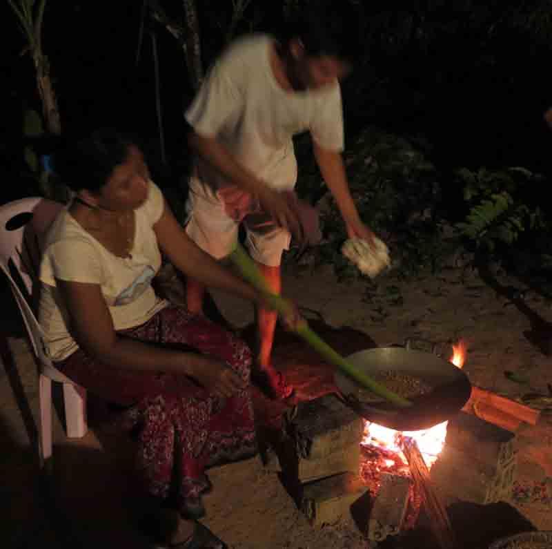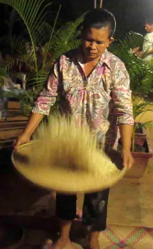 ជាដំបូងគេត្រូវយកស្រូវស្រស់មកលីងក្នុងអំបែងឬខ្ទះ រហូតដល់ស្រូវចាប់ផ្ទុះមួយៗទើបគេចាក់ស្រូវទៅក្នុងត្បាល់។ អ្នកដាល់ច្រើនមានគ្នាពីរនាក់គឺម្នាក់កាន់អង្រែដៃពីរឬអង្រែវែង និងម្នាក់ទៀតកាន់អង្រែដៃមួយឬអង្រែខ្លី។ ក្នុងពេលកំពុងដាល់យើងឃើញថាអ្នកកាន់អង្រែខ្លីហាក់ដូចជារហ័សរហួននិងសកម្មជាងម្នាក់ទៀត ដ្បិតដៃម្ខាងកាន់អង្រែនិងម្ខាងទៀតកាន់ឈើឆ្កៀស។ គេដាល់ទាល់តែឃើញថាអុំបុកពៀចសំប៉ែតនិងខ្ចាត់សម្បកស្រូវចេញអស់ទើបឈប់ ហើយបារដាក់ចង្អេរយកទៅអុំ។ ឯកាយវិការអុំនោះសោតក៏មានបែបមានបទច្រើនយ៉ាងដូចជារែង, អង្រួន, ស្ទៃ ជាដើម។ មុនពេលចាប់ផ្ដើមអុំគេត្រូវយកកញ្ច្រែងរែងមករែងកន្ទក់ចេញ ឬវិធីម្យ៉ាងទៀតគឺការ «ប្រទាក់» ដោយចង្អេរ ដើម្បីឱ្យអំបុកនិងកន្ទក់នៅផ្សេងពីគ្នា។ បន្ទាប់មកទៀតគឺអុំជម្រុះក្បាលអង្កាម ដោយអុំបណ្ដើរ «ក្នាច់» បណ្ដើរ។ ផ្នែកចុងក្រោយគឺគេអង្រួនចង្អេរឱ្យគ្រាប់អំបុកធំៗ ហៅថា «អង្ករដើម» និងគ្រាប់ស្រូវឡើងមកខាងលើ ដើម្បីងាយរើសគ្រាប់ស្រូវចេញឱ្យបានស្អាត។ កាយវិការទាំងអម្បាលម៉ាននេះ លំបាកនឹងបរិយាយពន្យល់ដោយមាត់ទទេឬគ្រាន់តែសរសេរណាស់ ទាល់តែបានឃើញនឹងភ្នែកស្រស់ទើបយល់។ សូមទស្សនាកម្រងរូបភាពដូចខាងក្រោមនេះ៖