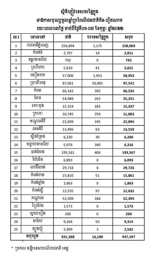 ភ្នំពេញ៖ ពិធីបុណ្យចូលឆ្នាំចិនចាប់ពីថ្ងៃទី១-៣ ខែកុម្ភៈ ឆ្នាំ២០២២ មានភ្ញៀវទេសចរចំនួន៩៤៧,៤៩៧នាក់បានដើរកម្សាន្តលេងនៅទូទាំងប្រទេស ក្នុងនោះមានភ្ញៀវទេសចរបរទេសចំនួន១៦,១៨៩នាក់។ ខេត្តចំនួន៥ដែលមានភ្ញៀវទេសចរទៅលេងច្រើនគឺមានរាជធានីភ្នំពេញ ខេត្តបាត់ដំបង ខេត្តព្រះសីហនុ ខេត្តកំពត និងខេត្តសៀមរាប។ នេះបើតាមរបាយការណ៍របស់ក្រសួងទេសចរណ៍។