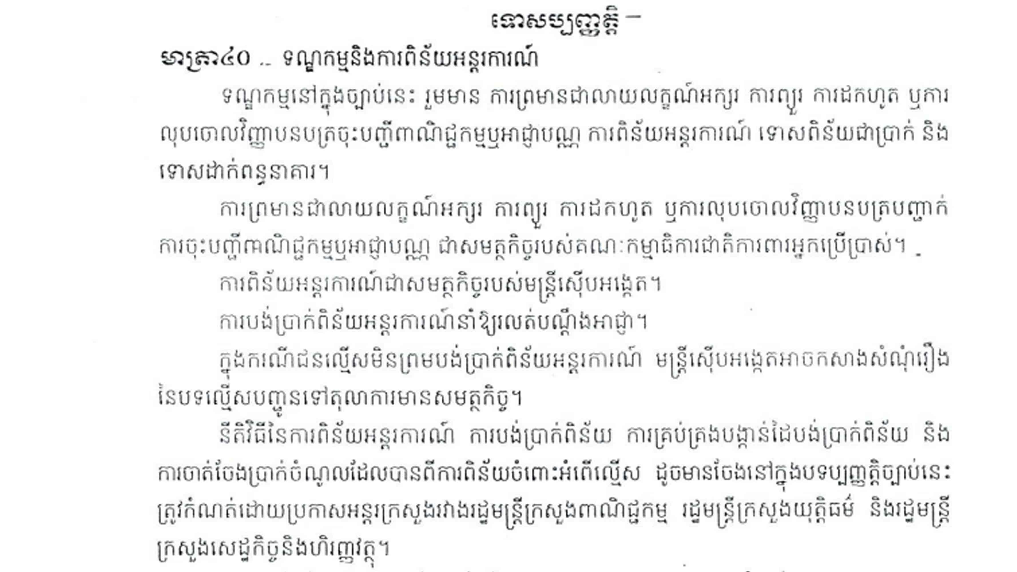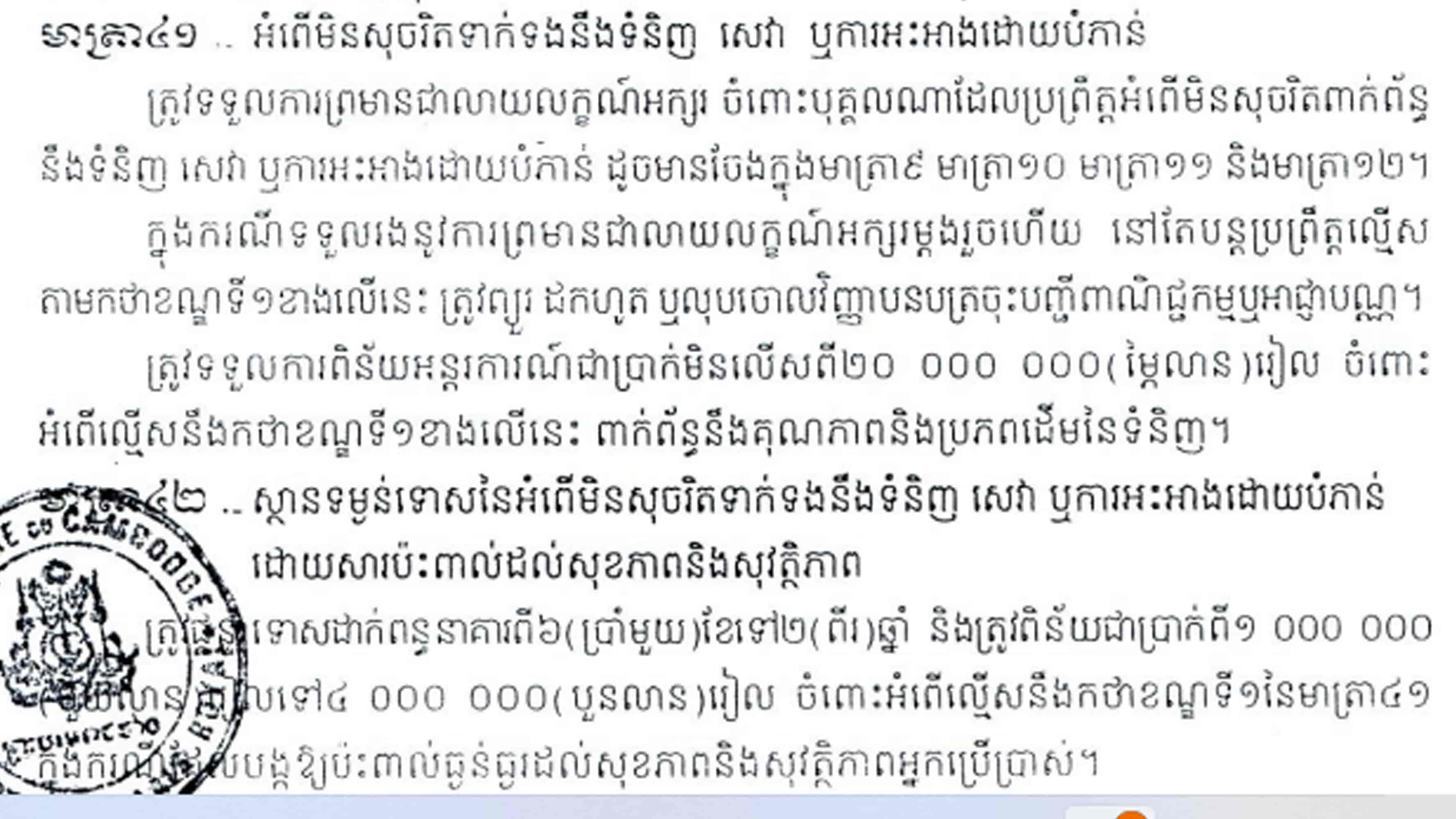 មាត្រា៤១ នៃច្បាប់ ចែងថា ក្នុងករណីទទួលរងនូវការព្រមានជាលាយលក្ខណ៍អក្សរម្ដងរួចហើយ នៅតែបន្តប្រព្រឹត្តល្មើស តាមកថាខណ្ឌទី១ខាងលើនេះ ត្រូវព្យួរ ដកហូត ឬលុបចោលវិញ្ញាបនបត្រចុះបញ្ជីពាណិជ្ជកម្មឬអាជ្ញាបណ្ណ។ ត្រូវទទួលការពិន័យអន្តរការណ៍ជាប្រាក់មិនលើសពី២០.០០០.០០០(ម្ភៃលាន)រៀល ចំពោះអំពើល្មើសនឹងកថាខណ្ឌទី១ខាងលើនេះ ពាក់ព័ន្ធនឹងគុណភាពនិងប្រភពដើមនៃទំនិញ។