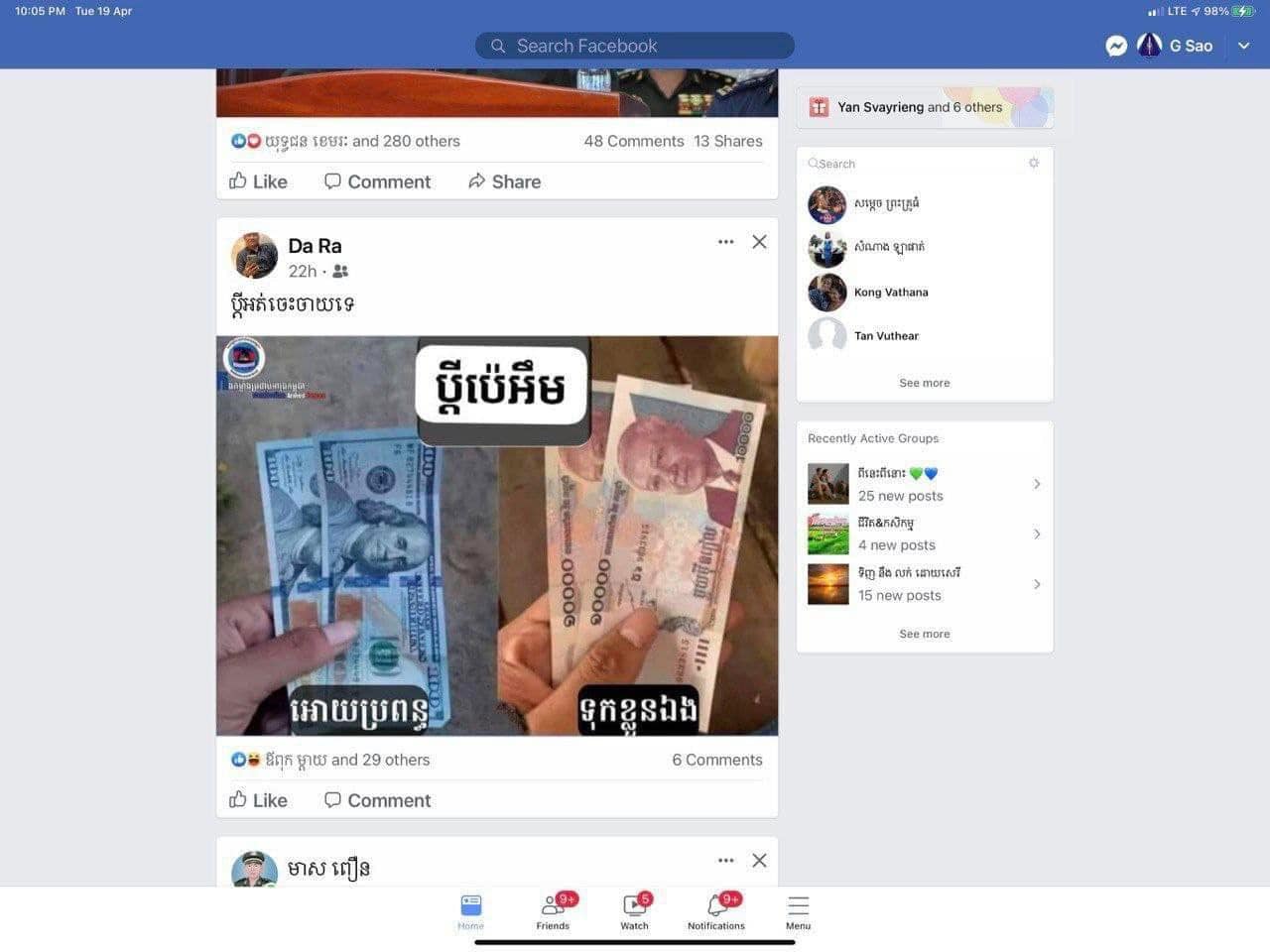ភ្នំពេញ៖ ក្រោយពីកងរាជអាវុធហត្ថបានឃើញគណនីហ្វេសប៊ុកឈ្មោះ «Da Ra» បង្ហោះរូបភាពអំពី«ប្តីប៉េអឹមទុកលុយឲ្យប្រពន្ធច្រើន និងទុកឲ្យខ្លួនតិច និងបានសរសេរសារថា ប្តីអត់ចេះចាយលុយទេ» ឯកឧត្តម នាយឧត្តមសេនីយ៍ សៅ សុខា អគ្គមេបញ្ជាការរងនៃកងយោធពលខេមរភូមិន្ទ មេបញ្ជាការកងរាជអាវុធហត្ថលើផ្ទៃប្រទេសបានបញ្ជាឲ្យអ្នកជំនាញស្រាវជ្រាវ។ ទើបដឹងថាបុគ្គលរូបនោះបានពាក់ឯកសណ្ឋានកងរាជអាវុធហត្ថក្លែងក្លាយ និងមិនមានឈ្មោះក្នុងបញ្ជីគ្រប់គ្រងចំនួនទ័ពរបស់កងរាជអាវុធហត្ថឡើយ។