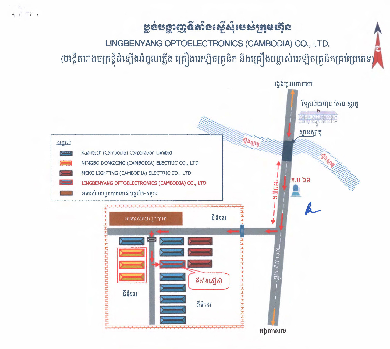 ៣-ក្រុមហ៊ុន “LINGBENYANG OPTOELECTRONICS (CAMBODIA) CO., LTD” គម្រោងបង្កើតរោងចក្រផ្គុំដំឡើងអំពូលភ្លើង គ្រឿងអេឡិចត្រូនិក និងគ្រឿងបន្លាស់អេឡិចត្រូនិកគ្រប់ប្រភេទ ដែលមានទីតាំងវិនិយោគស្ថិតនៅភូមិចមពល ឃុំពពេល ស្រុកត្រាំកក់ ខេត្តតាកែវ ក្នុងទុនវិនិយោគប្រមាណ ៥,២លានដុល្លារអាម៉េរិក។