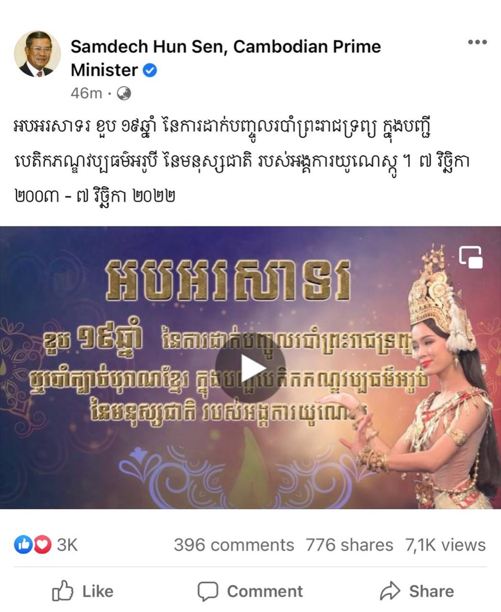 (រាជធានីភ្នំពេញ)៖ ក្នុងឱកាស ខួបលើកទី១៩ឆ្នាំ នៃការដាក់បញ្ចូលរបាំព្រះរាជទ្រព្យ ក្នុងបញ្ជីបេតិកភណ្ឌវប្បធម៌អរូបីនៃមនុស្សជាតិរបស់អង្គការយូណេស្កូ កាលព្រឹកថ្ងៃទី០៧ ខែវិច្ឆិកា ឆ្នាំ២០២២នេះ សម្ដេចតេជោ ហ៊ុន សែន នាយករដ្ឋមន្ត្រីនៃកម្ពុជា បានបង្ហោះសារតាមរយៈទំព័រហ្វេប៊ុកផ្លូវការរបស់សម្តេច ដើម្បីអបអរសាទរខួប១៩ឆ្នាំ នៃការដាក់បញ្ចូលរបាំនេះផងដែរ។