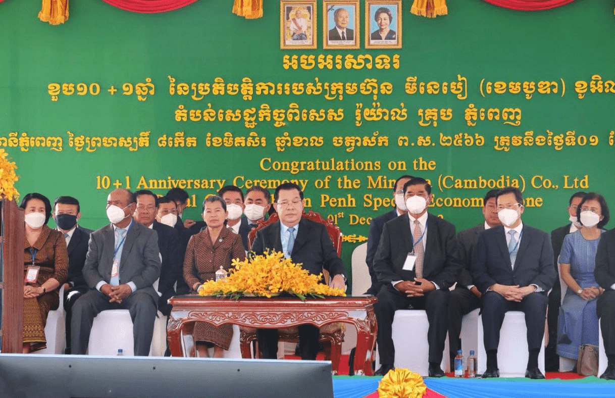 ថ្លែងក្នុងពិធីអបអរសាទរខួប ១១ឆ្នាំ នៃប្រតិបត្តិការរបស់ក្រុមហ៊ុនមីនីបៀ Minebea(Cambodia) របស់ជប៉ុន នៅតំបន់សេដ្ឋកិច្ចពិសេសភ្នំពេញ សម្តេចតេជោ ហ៊ុន សែន បានលើកឡើងថា កំណើនក្រុមហ៊ុនវិនិយោគនៅកម្ពុជា គឺកើតឡើងដោយសារកត្តាធំៗ២ គឺដោយសារតែសន្តិភាព និងស្ថិរភាពនយោបាយកម្ពុជា រួមជាមួយនឹងការលើកទឹកចិត្តមូយចំនួន បានធ្វើឱ្យមានការទាក់ទាញវិនិយោគិនមកកម្ពុជាជាច្រើន។