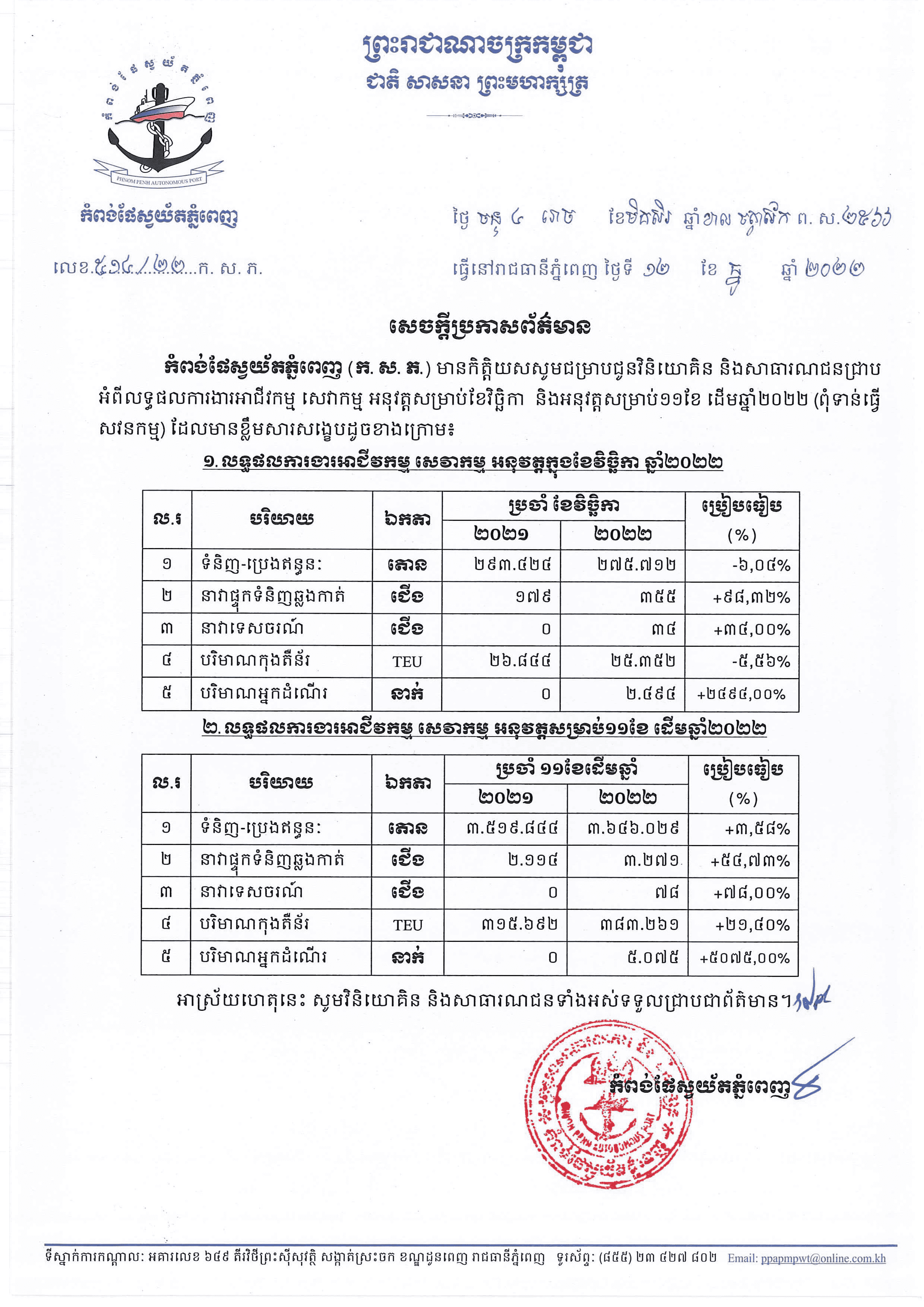បើតាមកំពង់ផែស្វយ័តភ្នំពេញ ក្រៅពីរកចំណូលបានជាង៣៧លានដុល្លារហើយនោះ ដោយឡែក ចំពោះលទ្ធផលការងារអាជីវកម្ម សេវាកម្ម អនុវត្ដសម្រាប់១១ខែ ឆ្នាំ២០២២ របស់កំពង់ផែនេះ ក៏សម្រេចបានលើសកម្មភាពសំខាន់ៗចំនួន៥ ថែមទៀតផងដែរ ដែលនៅក្នុងនោះរួមមាន៖ ទី១៖ ទំនិញ-ប្រេងឥន្ធនៈមានចំនួន ៣,៦៤៦,០២៩តោន កើនឡើង៣.៥៨% បើប្រៀបធៀបរយៈពេលដូចគ្នានៅឆ្នាំ២០២១ ចំនួន ៣,៥១៩,៨៤៤តោន។ ទី២៖ នាវាផ្ទុកទំនិញឆ្លងកាត់ មានចំនួន ៣,២៧១ជើង កើនឡើងជាង៥៤ភាគរយ បើប្រៀបធៀបរយៈពេលដូចគ្នា នៅឆ្នាំ២០២១ ចំនួន២,១១៤ជើង។ ទី៣៖ បរិមាណកុងតឺន័រ មានចំនួន ៣៨៣,២៦១ធីអ៊ីយូ កើនឡើងជាង២០ភាគរយ បើប្រៀបធៀបរយៈពេលដូចគ្នា នៅឆ្នាំ២០២១ ចំនួន៣១៥,៦៩២ធីអ៊ីយូ។ ទី៤៖ នាវាទេសចរណ៍ មានចំនួន៧៨ជើង កើនឡើង៧៨ ភាគរយ។ និងទី៥៖ បរិមាណអ្នកដំណើរ មានចំនួន៥,០៧៥នាក់ កើនឡើងជាង៥ពាន់ភាគរយ។