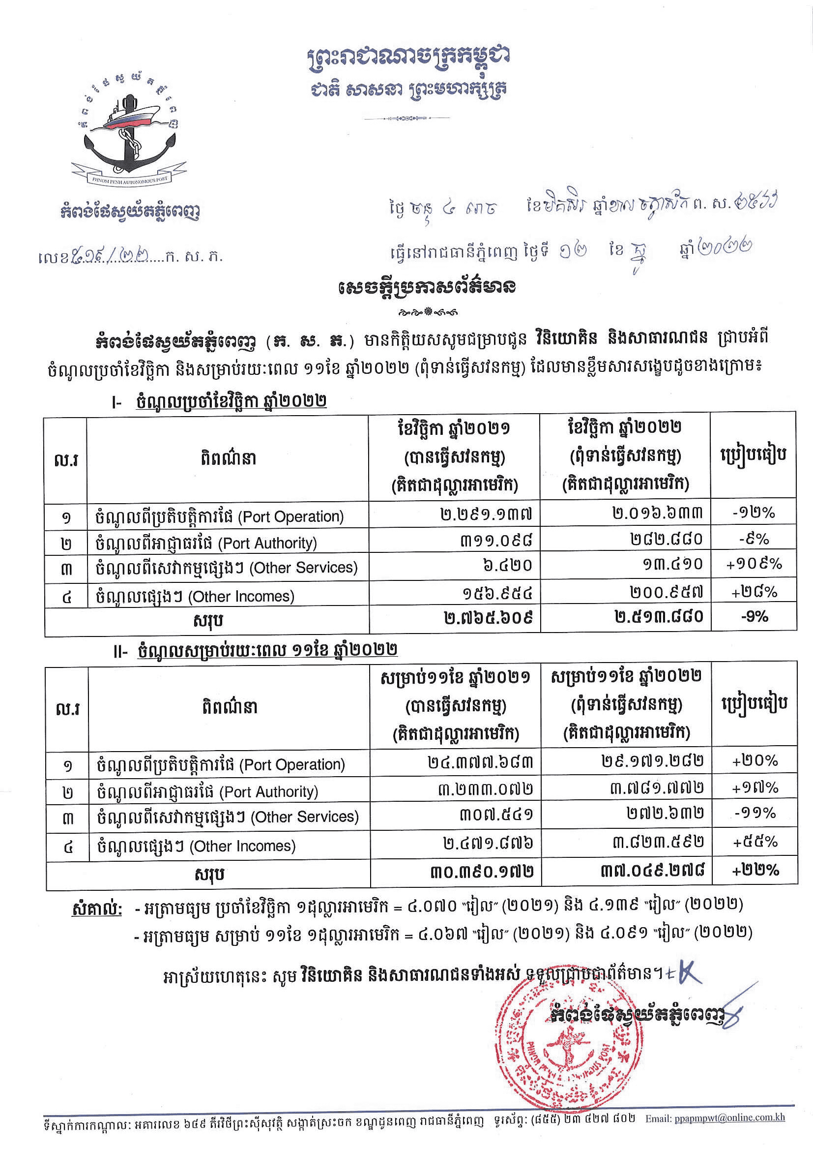 (រាជធានីភ្នំពេញ)៖ កំពង់ផែស្វយ័តភ្នំពេញ នៅល្ងាចថ្ងៃទី២៦ ខែធ្នូ ឆ្នាំ២០២២នេះ បានប្រកាសឱ្យដឹងថា រយៈពេល១១ខែ ឆ្នាំ២០២២នេះ កំពង់ផែស្វយ័តភ្នំពេញ រកចំណូលបានជិត៤០លានដុល្លារ ខណៈចំណូលនេះ គឺទទួលបានពីប្រភពសំខាន់ៗចំនួន៥...។