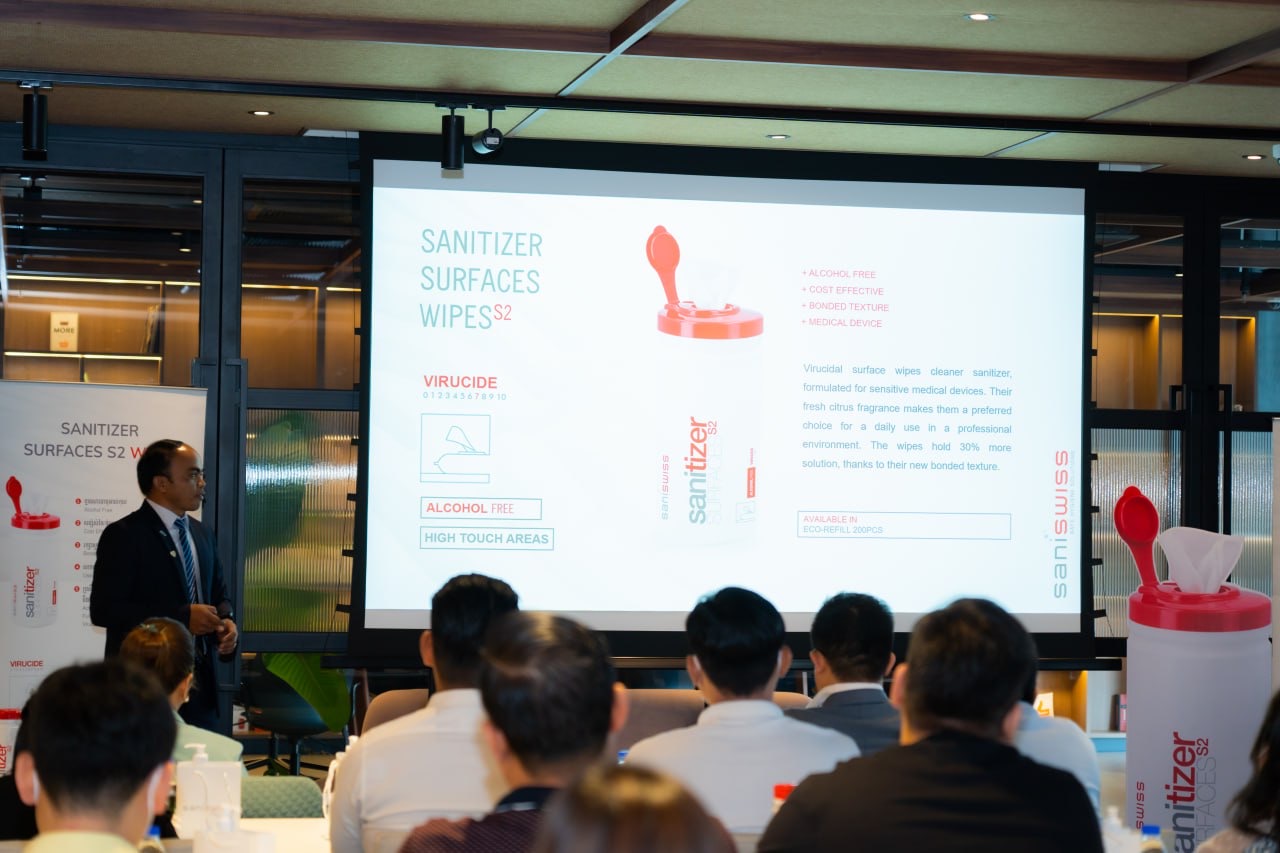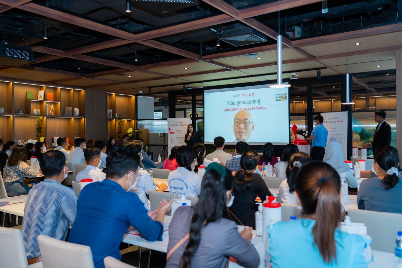 រាជធានីភ្នំពេញ៖ ក្រុមហ៊ុន សានីស្វីស ឌីស្ទ្រីប្យ៊ូសិន (ខេមបូឌា) ឯ.ក បានធ្វើសិក្ខាសាលាមួយ ស្តីពីការណែនាំអំពីផលិតផលកម្ចាត់មេរោគ Saniswiss Sanitizer Surfaces S2 Wipes ដែលជាផលិតផលថ្មីគ្មានសារធាតុអាល់កុល និងមានប្រសិទ្ធភាពកម្ចាត់មេរោគខ្ពស់។ សិក្ខាសាលានេះបានធ្វើឡើងនៅរសៀលថ្ងៃទី១៨ ខែកុម្ភៈ ឆ្នាំ២០២៣ នៅអគារវឌ្ឍនៈ កាពីតាល់។