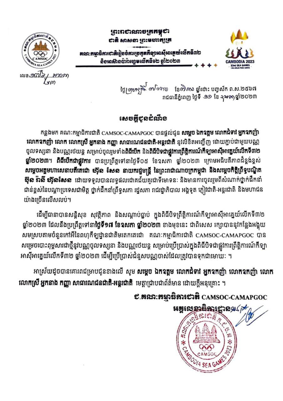 យោងតាមសេចក្ដីជូនដំណឹងរបស់អគ្គលេខាធិការដ្ឋាន CAMSOC បានឱ្យដឹងនៅរសៀលថ្ងៃទី១១ ខែឧសភា ឆ្នាំ២០២៣យ៉ាងដូច្នេះថា៖ «ដើម្បីធានាបានសន្ដិសុខ សុវត្ថិភាព និងសណ្ដាប់ធ្នាប់ ក្នុងពិធីបិទព្រឹត្តិការណ៍កីឡាស៊ីហ្គេម លើកទី៣២ ឆ្នាំ២០២៣ ដែលនឹងប្រព្រឹត្តទៅនាថ្ងៃទី១៧ ខែឧសភា ឆ្នាំ២០២៣ ខាងមុខ ជាពិសេសរក្សាបាននូវកន្លែងអង្គុយសមស្របតាមចំនួនកៅអីនៃពហុកីឡដ្ឋានជាតិមរតកតេជោ គណៈកម្មាធិការជាតិ CAMSOC-CAMAPGOC បានសម្រេចបោះពុម្ពសាជាថ្មីនូវបណ្ណចូលទស្សនា និងបណ្ណរថយន្ដ សម្រាប់ប្រើប្រាស់ស់ក្នុងពិធីបិទជាផ្លូវការ ព្រឹត្តិការណ៍កីឡាស៊ីហ្គេម លើកទី៣២ ដើម្បីប្រើប្រាស់ជំនួសបណ្ណចាស់ដែលត្រូវបានទុកជាមោឃ» ។ ទន្ទឹមនឹងនោះ គណៈកម្មាធិការជាតិ CAMSOC ក៏បានសុំការយោគយល់ចំពោះប្រជាពលរដ្ឋដែលពុំបានចូលទស្សនាផ្ទាល់ ដោយចំនួនកៅអីមានកំណត់មិនអាចឆ្លើយតបនឹងការចង់ចូលទស្សនាផ្ទាល់រ៉ាប់ម៉ឺននាក់ឡើយ។