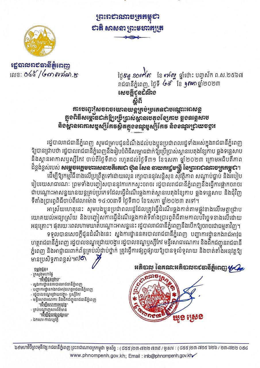 លិខិតដដែលបានអះអាថា៖ «ដើម្បីឱ្យកម្មវិធីខាងលើប្រព្រឹត្តទៅដោយរលូនរក្សាបាននូវសន្តិសុខ សុវត្ថិភាព សណ្ដាប់ធ្នាប់ និងរបៀបរៀបរយសាធារណៈ ព្រមទាំងបញ្ចៀសបាននូវការកកស្ទះចរាចរ រដ្ឋបាលរាជធានីភ្នំពេញ នឹងធ្វើការផ្អាកចរាចរជាបណ្ដោះអាសន្នយានយន្តគ្រប់ប្រភេទដែលធ្វើដំណើរឆ្លងកាត់ស្ពានបេតុងខ្សែកាប ឆ្លងទន្លេសាប និងជុំវិញទីតាំងប្រារព្ធពិធីចាប់ពីវេលាម៉ោង ១៤:០០នាទី ថ្ងៃទី៣០ ខែឧសភា ឆ្នាំ២០២៣ តទៅ» ។