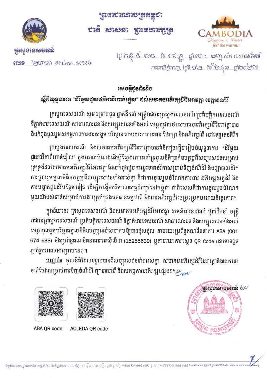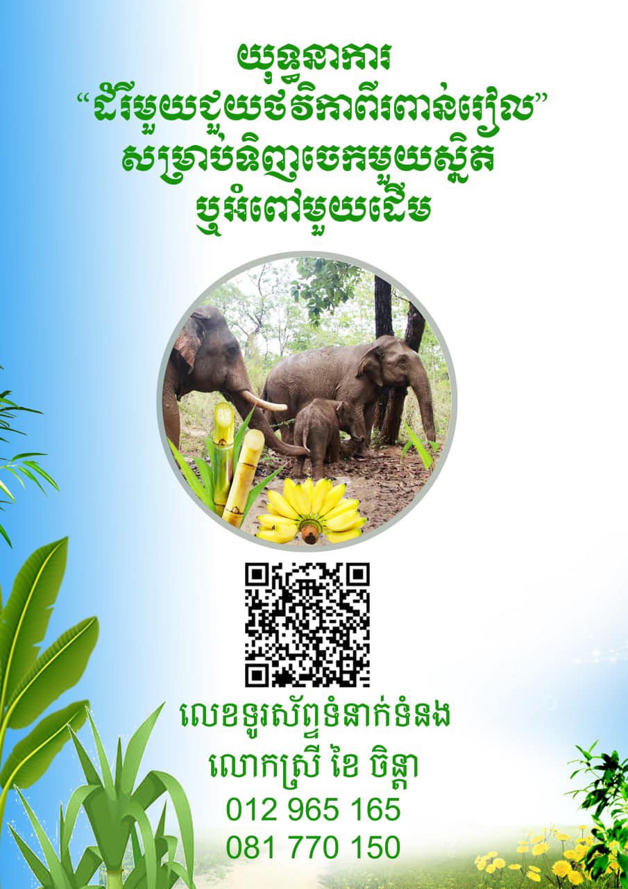 រាជធានីភ្នំពេញ៖ ក្រសួងទេសចរណ៍បានរៀបចំយុទ្ធនាមួយ ដែលឱ្យឈ្មោះថា «ដំរីមួយ ជួយថវិកាពីរពាន់រៀល» សម្រាប់ទិញចេកមួយស្និត ឬអំពៅមួយដើម ដែលជាយុទ្ធនាការសំដៅកៀងគរ ការបរិច្ចាគថវិកាពីសប្បុរសជនទាំងក្នុងនិងក្រៅប្រទេស ដើម្បីទ្រទ្រង់ដល់ សមាគមអភិរក្ស ដំរី អៃរាវត្តា ដែលកំពុងខ្វះខាតថវិកាសម្រាប់ទិញចំណី និងព្យាបាលដល់សត្វដំរី។