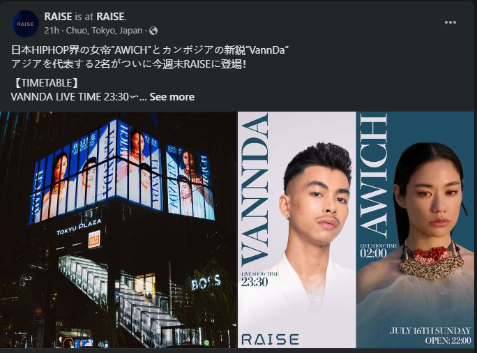 សិល្បៈ៖ ដឹងតែកក្រើកហើយនៅចុងសប្តាហ៍នេះ វណ្ណដា នឹងមានការច្រៀងសម្តែងនៅ RAISE Club ក្នុងទីក្រុង Tokyo ប្រទេសជប៉ុន រួមជាមួយតារាចម្រៀងរ៉េបប្រទេសជប៉ុន Awich ផងដែរ។ ខណៈដែលអ្នកគាំទ្រទាំងក្នុង និងក្រៅប្រទេសជប៉ុន កំពុងតែជ្រួលច្រាលចង់ទៅជួបអាយដលរបស់ខ្លួនដោយផ្ទាល់ ក្រោយបានឃើញការផុសរូបភាពប៉ុន្មានសន្លឹកពីក្លឹប RAISE ដែលកំពុងត្រៀមទទួលកំពូលតារាចម្រៀងរ៉េបទាំងពីរ នឹងត្រូវបង្ហាញខ្លួននាថ្ងៃទី១៦ ខែកក្កដា ឆ្នាំ២០២៣...។
