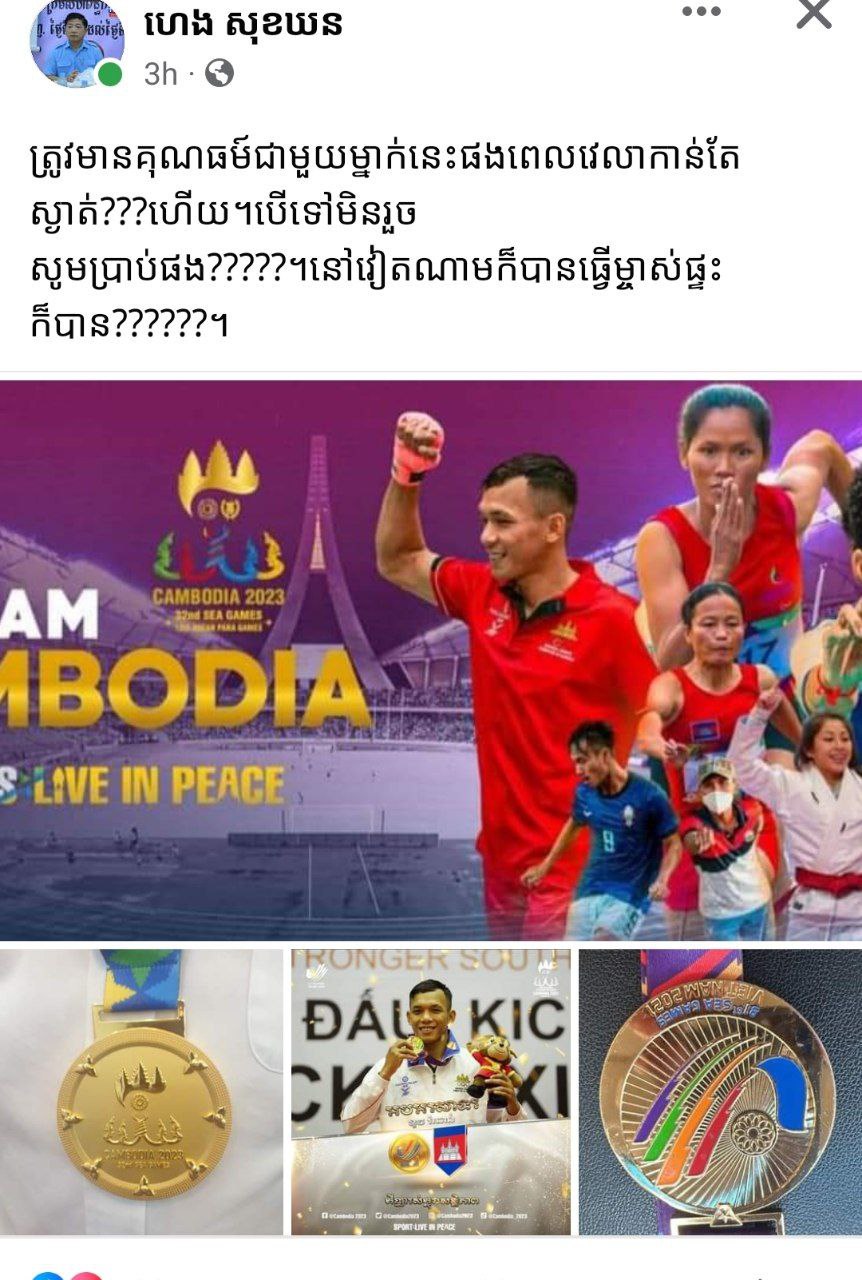 ដោយមើលឃើញពីទុក្ខលំបាករបស់កីឡាករក្នុងក្រុមជម្រើសជាតិរបស់ខ្លួន លោក ហេង សុខឃន អគ្គលេខាធិការសហព័ន្ធប្រដាល់គុនខ្មែរ និងជាប្រធានសហព័ន្ធកីឡាឃីកបុកស៊ីងកម្ពុជា បានបង្ហោះសារលើគណនីផ្លូវការរបស់លោកនៅព្រឹកថ្ងៃព្រហស្បតិ៍ទី២៤ ខែសីហា ឆ្នាំ២០២៣នេះ ថា៖ «ត្រូវមានគុណធម៍ជាមួយម្នាក់នេះផងពេលវេលាកាន់តែស្ងាត់???ហើយបើទៅមិនរួចសូមប្រាប់ផង?????។ នៅវៀតណាមក៏បាន ធ្វើម្ចាស់ផ្ទះក៏បាន??????»។ សំណេរ ដោយភ្ជាប់ជាមួយរូបថតកីឡាករ ប៊ឺត សង្ឃឹម និងក្រុមអត្តពលិកជម្រើសជាតិផ្សេងទៀត ទំនងជាលោក ហេង សុខឃន ចង់សំដៅលើការទទួលបានជោគជ័យជូនជាតិ ដែលអត្តពលិករូបនេះ សម្រេចបាននៅព្រឹត្តិការណ៍កីឡាស៊ីហ្គេម លើកទី៣១ នៅប្រទេសវៀតណាម និងលើកទី៣២ នៅប្រទេសកម្ពុជា ដែលកីឡាករ ប៊ឺត សង្ឃឹម ដណ្តើមបានមេដាយមាសទាំងពីរលើក តែបែរជាគ្មានឱកាសឡើងសង្វៀនប្រកួតដូចកីឡាករប្រដាល់មួយចំនួនទៀត ខណៈតួនាទីនៅក្នុងជួរមន្ត្រីរាជការក៏មិនទាន់លេចចេញជារូបរាងដែរ ទើបលោកយល់ថា ជាការមិនផ្តល់គុណធម៌ដល់កីឡាករ ប៊ឺត សង្ឃឹម។