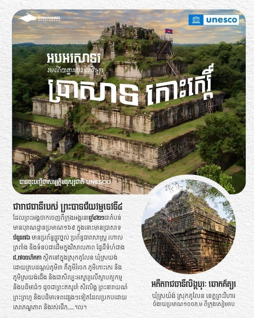 គួរបញ្ជាក់ផងដែរថា កាលពីថ្ងៃទី១៧ ខែកញ្ញា ឆ្នាំ២០២៣ ប្រាសាទកោះកោះកេរ ដែលជា(អតីតរាជធានីលិង្គបុរៈ[ឆោកគ៌គ្យរ=អានថាឆោកគគីរ]) មានទីតាំងស្ថិតនៅក្នុងភូមិស្រយង់ជើង ឃុំស្រយង់ ស្រុកគូលែន ខេត្តព្រះវិហារ មានចម្ងាយប្រមាណ៦០គីឡូម៉ែត្រ ពីទីរួមខេត្តព្រះវិហារ។ ជាទីតាំងអតីតរាជធានី របស់ព្រះបាទជ័យវរ្ម័នទី៤ ដែលត្រូវបានកសាងឡើងក្នុងសតវត្សទី១០ (៩២៨-៩៤២) ត្រូវបានអង្គការ UNCESCO ប្រកាសដាក់បញ្ចូលជាសម្បត្តិបេតិកភណ្ឌពិភពលោកជាផ្លូវការ៕