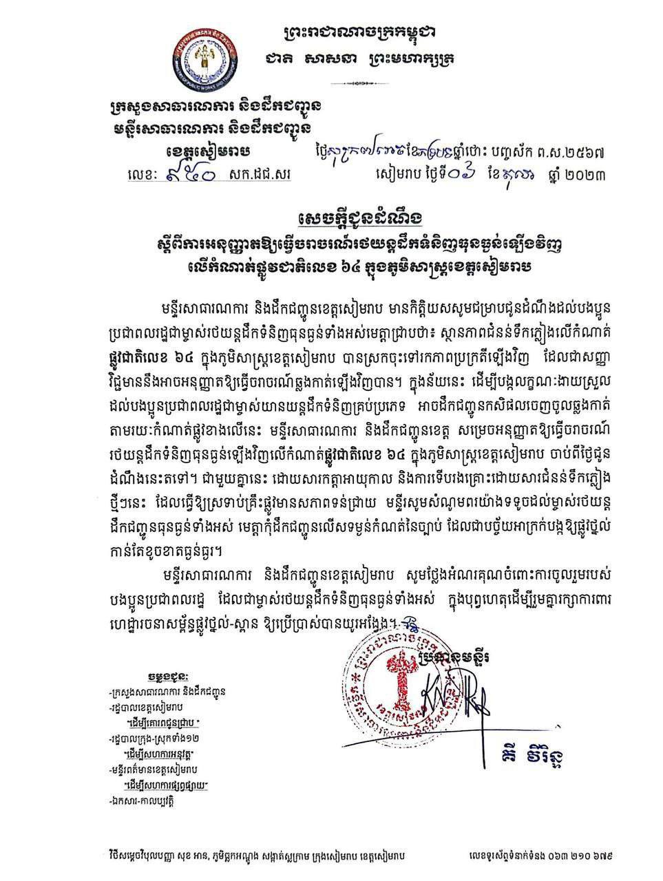 ខេត្តសៀមរាប៖ មន្ទីរសាធារណការ និងដឹកជញ្ជូនខេត្តសៀមរាប អនុញ្ញាតឱ្យរថយន្តដឹកទំនិញធំៗចរាចរឡើងវិញលើកំណាត់ផ្លូវជាតិលេខ៦៤ ក្នុងភូមិសាស្ត្រខេត្តសៀមរាប ក្រោយផ្អាកអស់ពីរថ្ងៃដោយសារជំនន់ទឹកភ្លៀង។ នេះបើ យោងតាមសេចក្តីជូនដំណឹងរបស់មន្ទីរសាធារណការ និងដឹកជញ្ជូនខេត្តសៀមរាបនៅថ្ងៃទី០៦ខែតុលា ឆ្នាំ២០២៣។