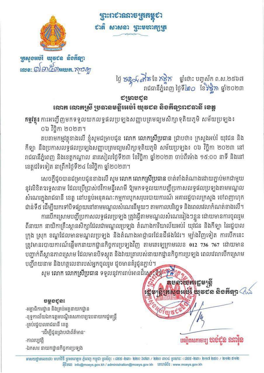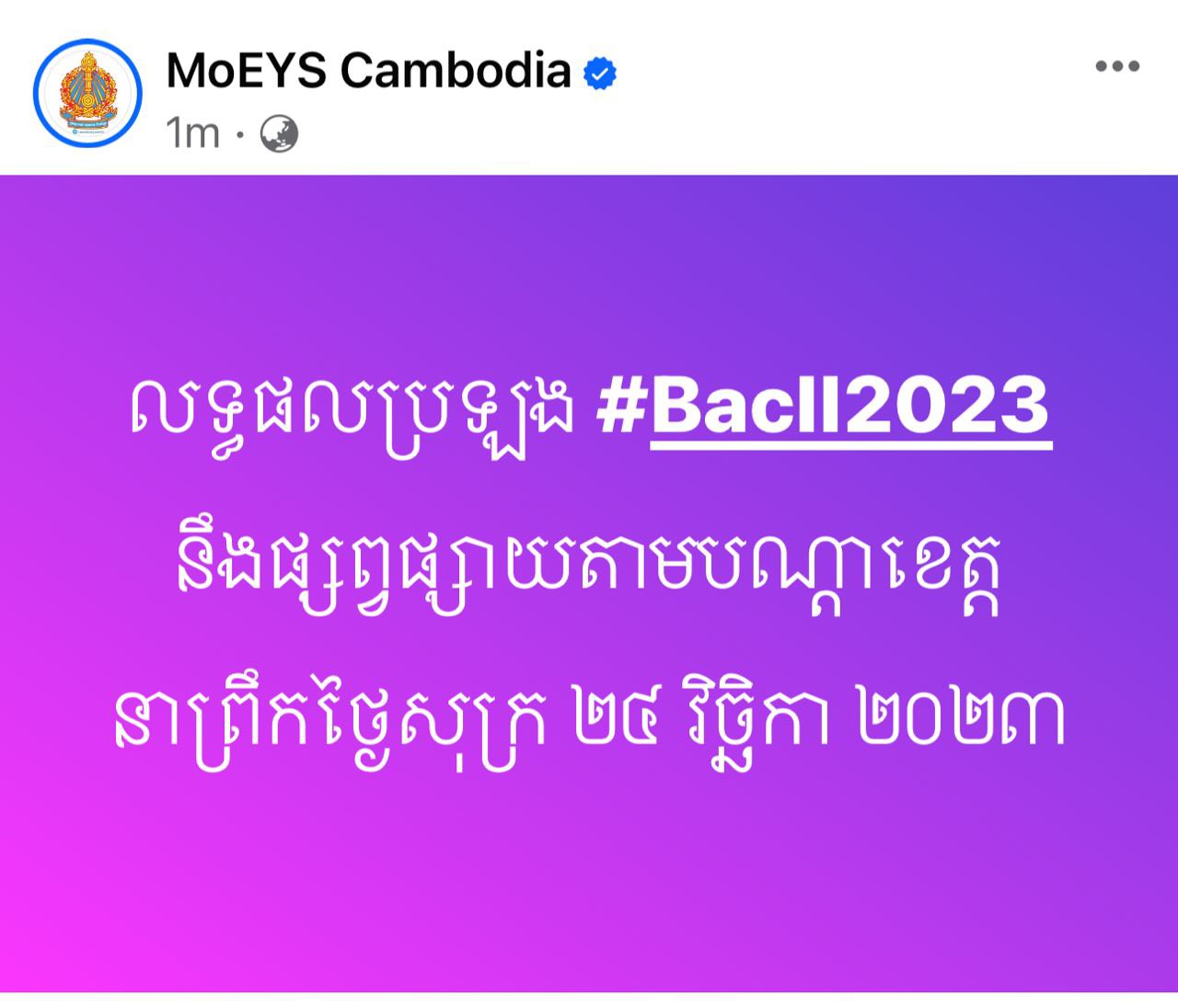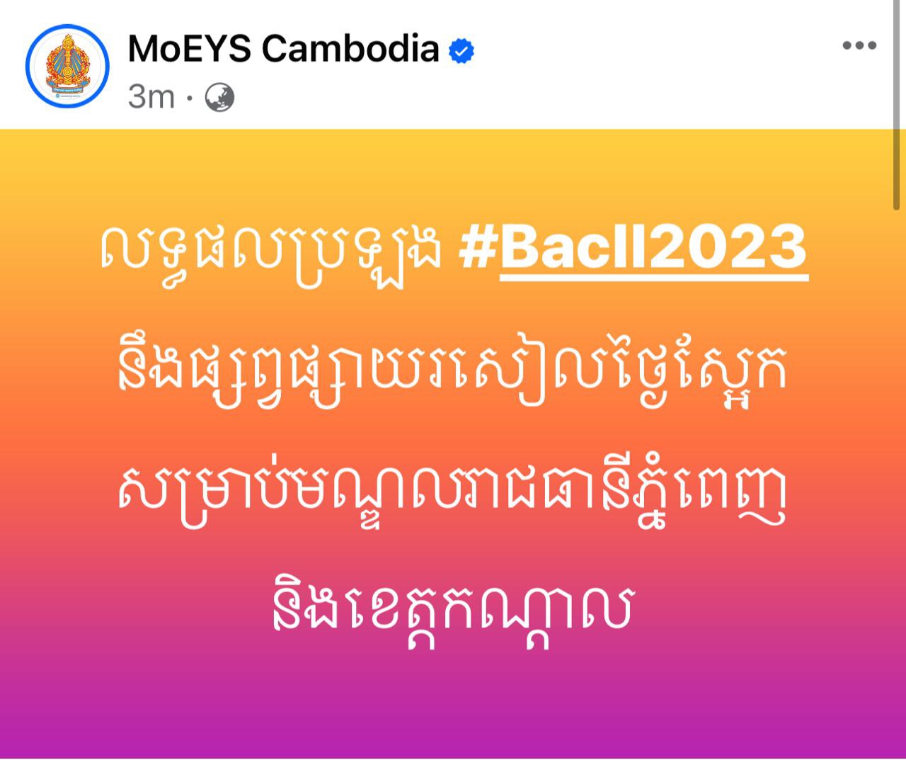 រាជធានីភ្នំពេញ៖ ក្រសួងអប់រំ យុវជន និងកីឡា បានឱ្យដឹងថា លទ្ធផលនៃដំណើរការប្រឡងសញ្ញាបត្រមធ្យមសិក្សាទុតិយភូមិ ឬបាក់ឌុប សម័យប្រឡង៦វិច្ឆិកា ឆ្នាំ២០២៣ នឹងត្រូវប្រកាសមុនថ្ងៃកំណត់ ពោលគឺនៅវេលាម៉ោង១៥:០០នាទីរសៀលថ្ងៃទី២៣ ស្អែកនេះ សម្រាប់មណ្ឌលរាជធានីភ្នំពេញ និងខេត្តកណ្តាល។ រីឯតាមបណ្តាខេត្តនានា លទ្ធផលប្រឡងនឹងត្រូវប្រកាសនៅព្រឹកថ្ងៃទី២៤ វិច្ឆិកា ឆ្នាំ២០២៣...។