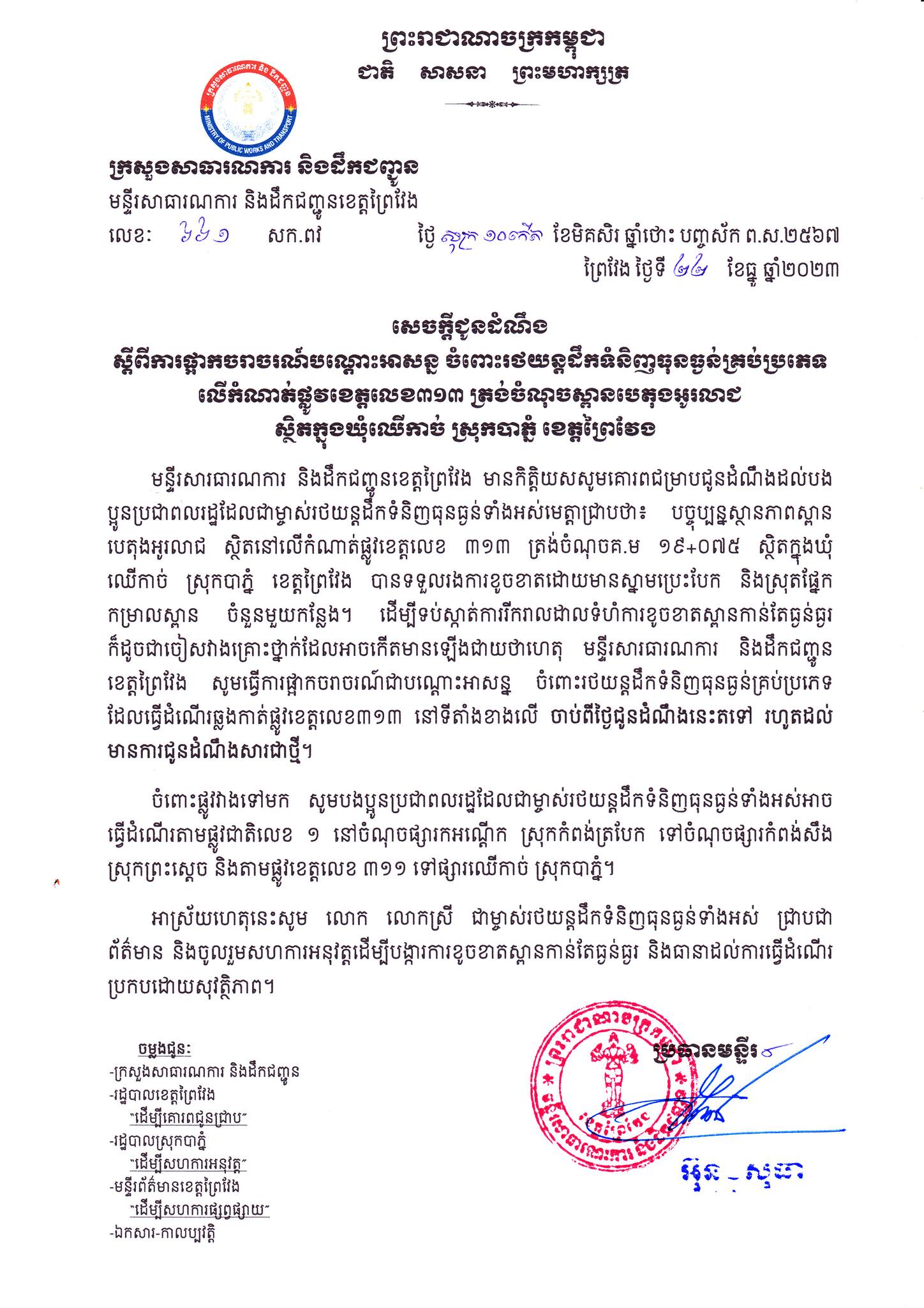 មន្ទីរសារធារណការ និងដឹកជញ្ជូនខេត្តព្រៃវែង បានគូសបញ្ជាក់ឱ្យដឹងថា៖«បច្ចុប្បន្នស្ថានភាពស្ពានបេតុង អូរ ស្ថិតនៅលើកំណាត់ផ្លូវខេត្តលេខ៣១៣ ត្រង់ចំណុចគ.ម ១៩+០៧៥ ស្ថិតក្នុងឃុំ ឈើកាច់ ស្រុកបាភ្នំ ខេត្តព្រៃវែង បានទទួលរងការខូចខាតដោយមានស្នាមប្រេះបែក និងស្រុតផ្នែក កម្រាលស្ពាន ចំនួនមួយកន្លែងដើម្បីទប់ស្កាត់ការរីករាលដាលទំហំការខូចខាតស្ពានកាន់តែធ្ងន់ធ្ងរ ក៏ដូចជាចៀសវាងគ្រោះថ្នាក់ដែលអាចកើតមានឡើងជាយថាហេតុ មន្ទីរសារធារណការ និងដឹកជញ្ជូន ខេត្តព្រៃវែង សូមធ្វើការផ្អាកចរាចរណ៍ជាបណ្តោះអាសន្ន ចំពោះរថយន្តដឹកទំនិញធុនធ្ងន់គ្រប់ប្រភេទ ដែលធ្វើដំណើរឆ្លងកាត់ផ្លូវនៅទីតាំងខាងលើ ចាប់ពីថ្ងៃជូនដំណឹងនេះតទៅ រហូតដល់មានការជូនដំណឹងសាជាថ្មី»។