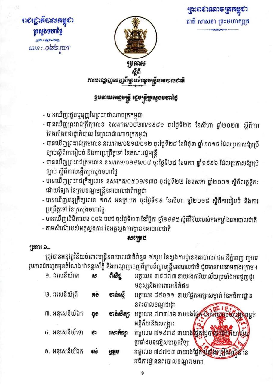 សេចក្តីសម្រេចដដែលបញ្ជាក់ថា មន្ត្រីទាំងនោះស្ថិតនៅក្រោមឱវាទអង្គភាពចម្រុះផ្សេងៗរួមមាន៖ ការិយាល័យប្រឆាំងការជួញដូរ មនុស្ស និងការពារអនីតិជន នាយផ្នែកអក្សរសម្ងាត់នៃអធិការដ្ឋាន នគរបាលខណ្ឌដង្កោ ការិយាល័យបង្ការពន្លត់អគ្គិភ័យនិងសង្គ្រោះ ការិយាល័យប្រឆាំងបទល្មើសបច្ចេកវិទ្យា ផ្នែកប្រឆាំងគ្រឿងញៀន នៃអធិការដ្ឋាននគរបាលខណ្ឌ៧មករា ផ្នែកការពារនិងអន្តរាគមន៍ នៃអធិការដ្ឋាននគរបាលខណ្ឌមានជ័យ ផ្នែកអន្តោប្រវេសន៍ នៃអធិការដ្ឋាននគរបាលខណ្ឌកំបូល មន្ត្រីនៃការរិយាល័យអន្តរាគមន៍ មន្ត្រីនៃស្នងការដ្ឋាននគរបាលរាជធានីភ្នំពេញ មន្ត្រីផ្នែកនគរបាលយុត្តិធម៌នៃអធិការ ដ្ឋាននគរបាលខណ្ឌព្រែកព្នៅ មន្ត្រីប៉ុស្តិ៍នគរបាលរដ្ឋបាលស្រះចក នៃអធិការដ្ឋាននគរបាលខណ្ឌដូនពេញ និងមន្ត្រីប៉ុស្តិ៍នគរបាលរដ្ឋបាលផ្សារដេប៉ូទី១ នៃអធិការដ្ឋាននគរបាលខណ្ឌទួលគោកផងដែរ៕