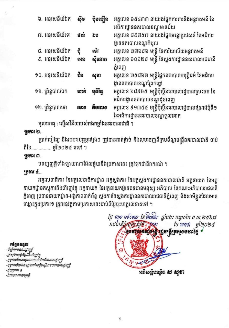 យោងទៅតាមសេចក្តីប្រកាសរបស់ក្រសួងមហាផ្ទៃ ស្តីពីការបណ្ដេញចេញពីក្របខ័ណ្ឌមន្ត្រីនគរបាលជាតិចុះថ្ងៃទី៣ ខែមករា ដែលទម្លាយតាមបណ្តាញសង្គមនារសៀលថ្ងៃទី៥ ខែមករា ឆ្នាំ២០២៤នេះ បានឱ្យដឹងថា មន្ត្រីនគរបាលជាតិទាំង១២ រូបដែលត្រូវបាន ឯកឧត្តមឧបនាយករដ្ឋមន្ត្រី រដ្ឋមន្ត្រីក្រសួងមហាផ្ទៃ អភិសន្តិបណ្ឌិត ស សុខា សម្រេចដកហូតមុខតំណែងឋានន្តរស័ក្កិ និងបណ្តេញចេញពីក្របខ័ណ្ឌនគរបាលជាតិនោះ មានឋានន្តរសក្តិចាប់ពីព្រិន្ទបាលទោ និងខ្ពស់បំផុត វរសេនីយ៍ទោ។