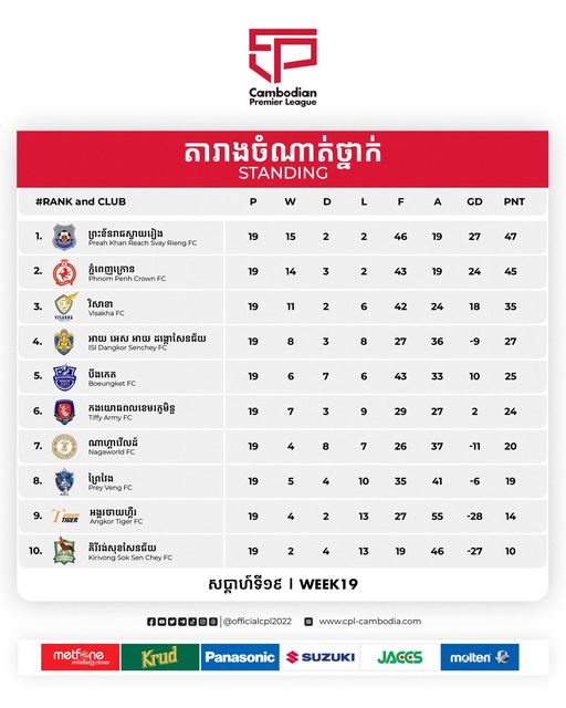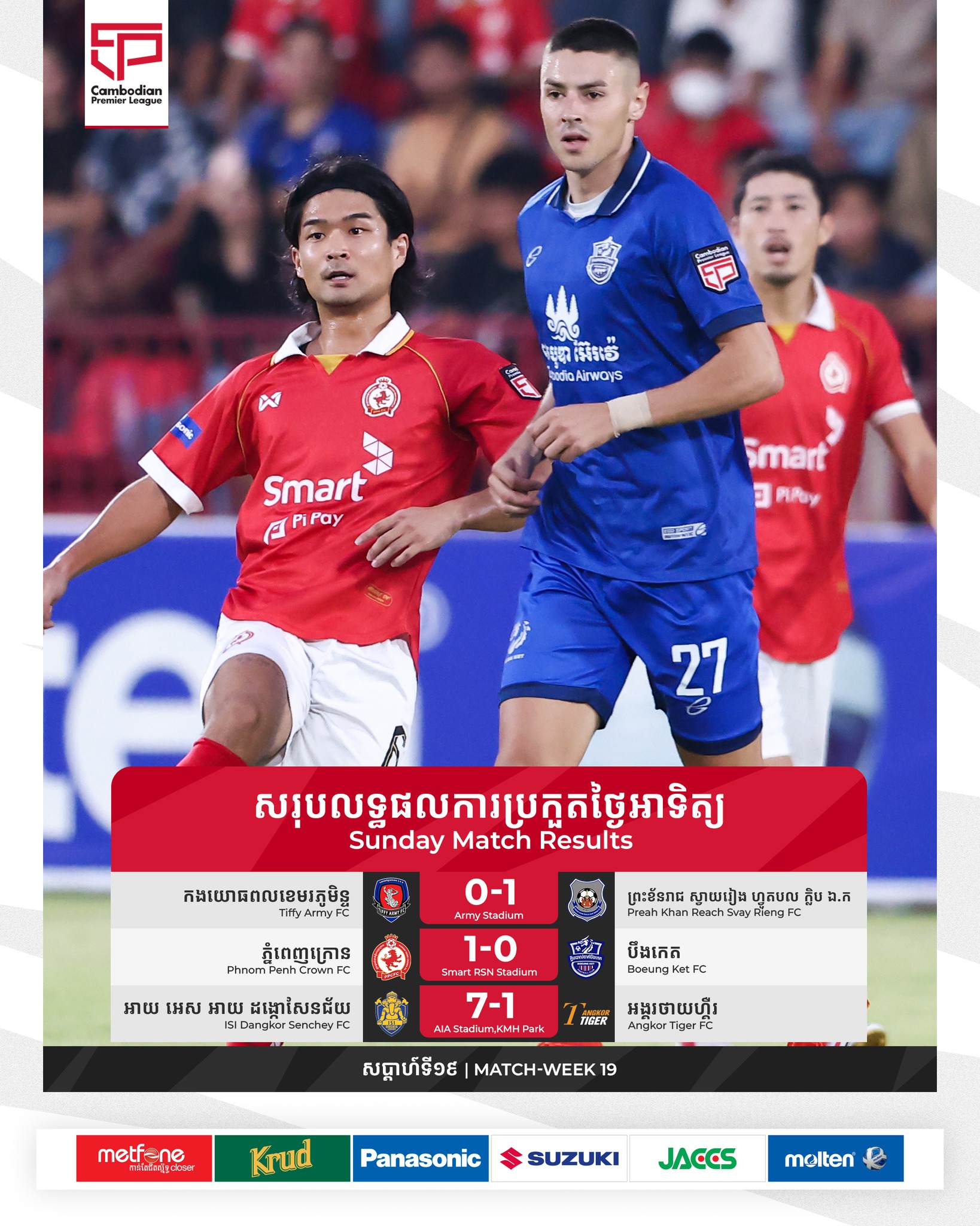 គួរបញ្ជាក់ថា បន្ទាប់ពីយកឈ្នះលើបឹងកេត ១-០ ក្រុមភ្នំពេញក្រោន នៅតេបន្តឈរនៅលេខរៀងទី២ ដដែល ដោយប្រដេញតាមពីក្រោយព្រះខ័នរាជស្វាយរៀង ដែលជាក្រុមឈរកំពូលតារាងក្នុងលីគសប្តាហ៍ទី ១៩ ក្រោយពីពួកគេយកឈ្នះលើ Tiffy Army FC ១-០។ ស្រពេល ISI ទ្បើងមក Top ៤ វិញ បន្ទាប់ពីយកឈ្នះលើអង្គរថាយហ្គឺរ ៧-១ កាលពីម្សិលមិញដូចគ្នា។ សូមជម្រាបថា ក្លឹបនាគខៀវបឹងកេតពេលប៉ះគ្នានៅ៦ប្រកួតចុងក្រោយនេះ មិនដែលយកឈ្នះសឹង្ហក្រហមភ្នំពេញក្រោនម្តងណាឡើយ ពោលគឺមានតែចាញ់និងស្មើ៕