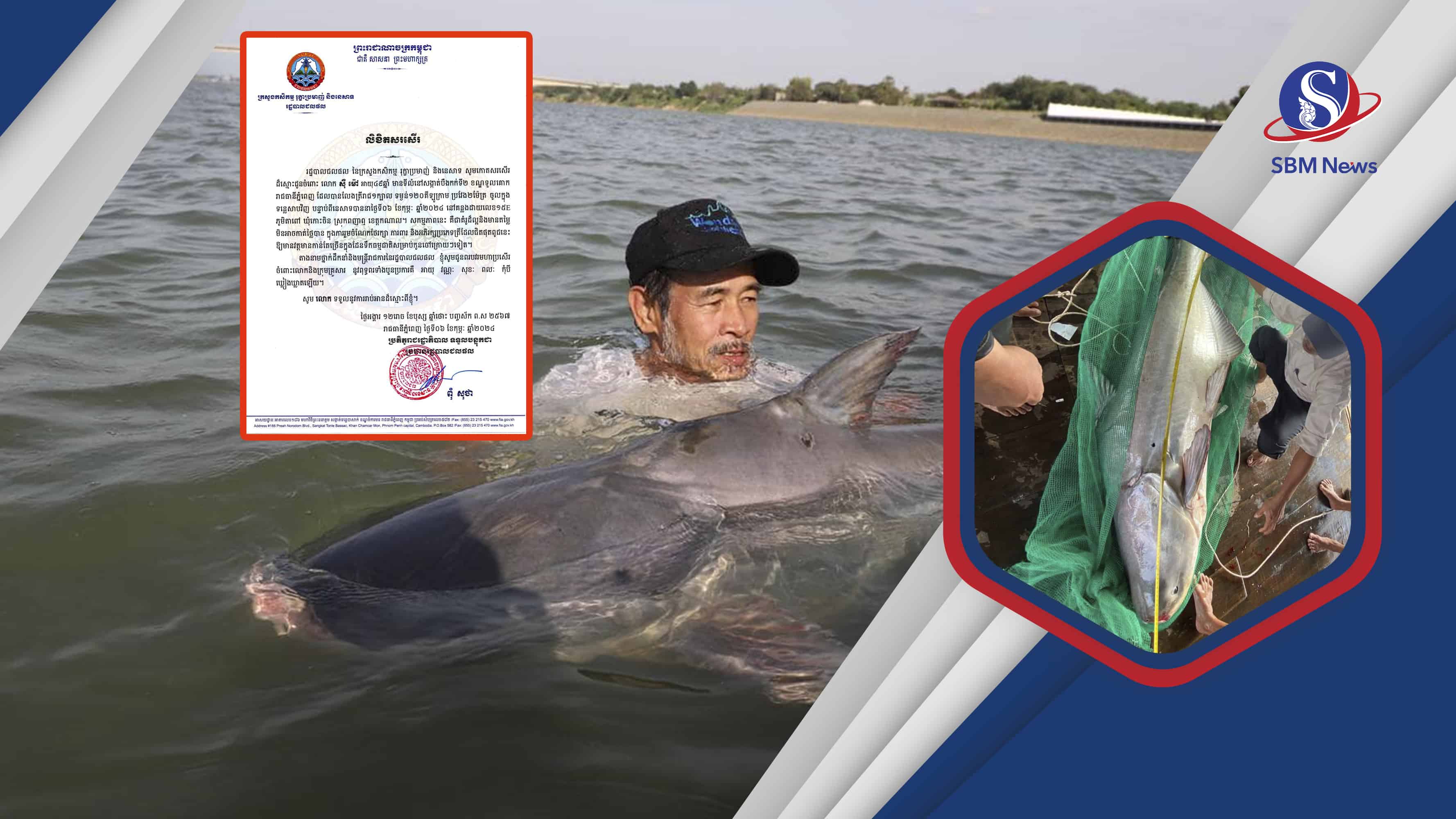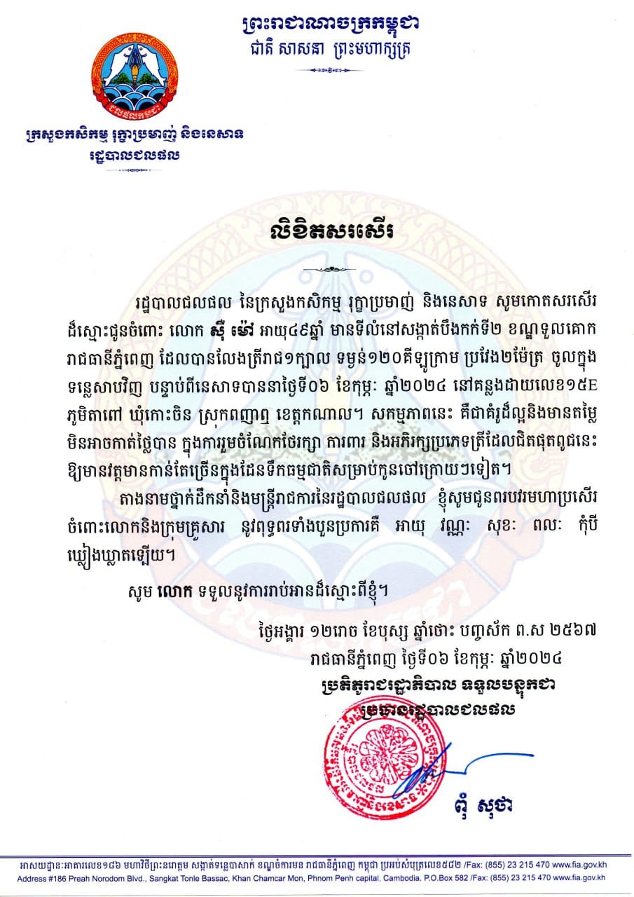 រាជធានីភ្នំពេញ៖ ប្រជានេសាទគំរូម្នាក់ដែលរស់នៅខណ្ឌទួលគោក រាជធានីភ្នំពេញ ទទួលបានលិខិតសរសើរពីរដ្ឋបាលជលផល ក្រោយលែងត្រីរាជ១ក្បាលទម្ងន់១២០គីឡូក្រាមចូលទន្លេវិញ បន្ទាប់ពីនេសាទបាន។ នេះបើយោងតាមការឱ្យដឹងពី រដ្ឋបាលជលផល កាលពីល្ងាចថ្ងៃទី០៧ ខែកុម្ភៈ ឆ្នាំ២០២៤...។