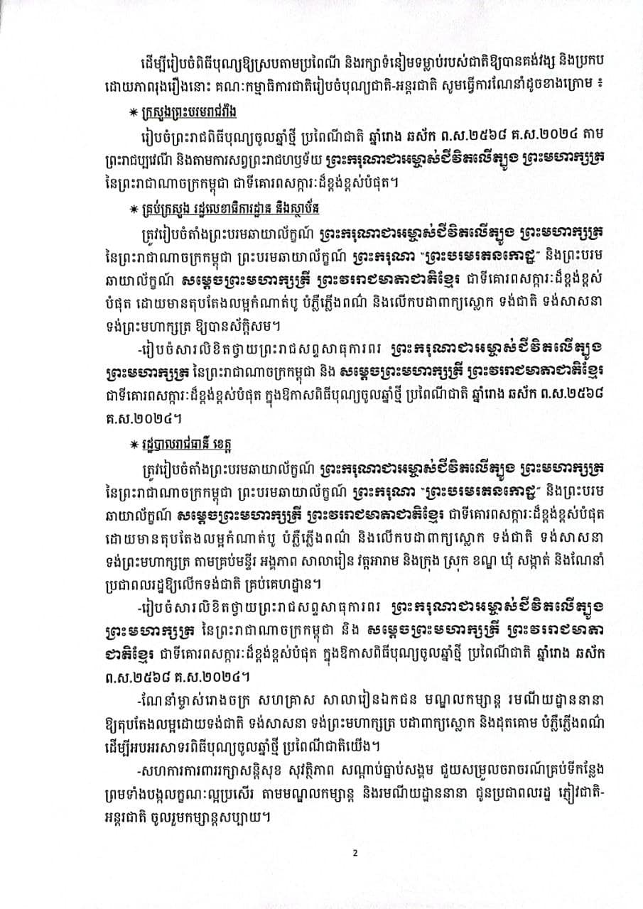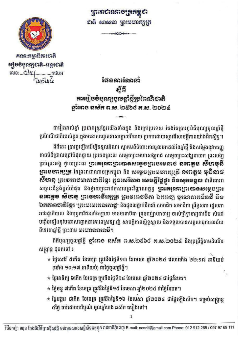 រាជធានីភ្នំពេញ៖ គណៈកម្មាធិការជាតិ រៀបចំបុណ្យជាតិ-អន្ដរជាតិ នៅថ្ងៃទី៧ ខែមីនា ឆ្នាំ២០២៤ បានដាក់ចេញផែនការណែនាំ «ការរៀបចំបុណ្យចូលឆ្នាំថ្មីប្រពៃណីជាតិ» ជាច្រើនចំណុចដល់រដ្ឋបាលរាជធានី ខេត្ត អនុវត្ត ដើម្បីឱ្យពិធីបុណ្យប្រព្រឹត្តទៅដោយរលូន និងមានប្រសិទ្ធភាពទប់ស្កាត់ឱ្យបានការលេងល្បែងខុសប្រពៃណីជាតិជាច្រើនដូចជា ល្បែងស៊ីសង ល្បែងជះទឹក លាបធ្យូង និងគ្រឿងផ្ទុះផ្សេងៗ។