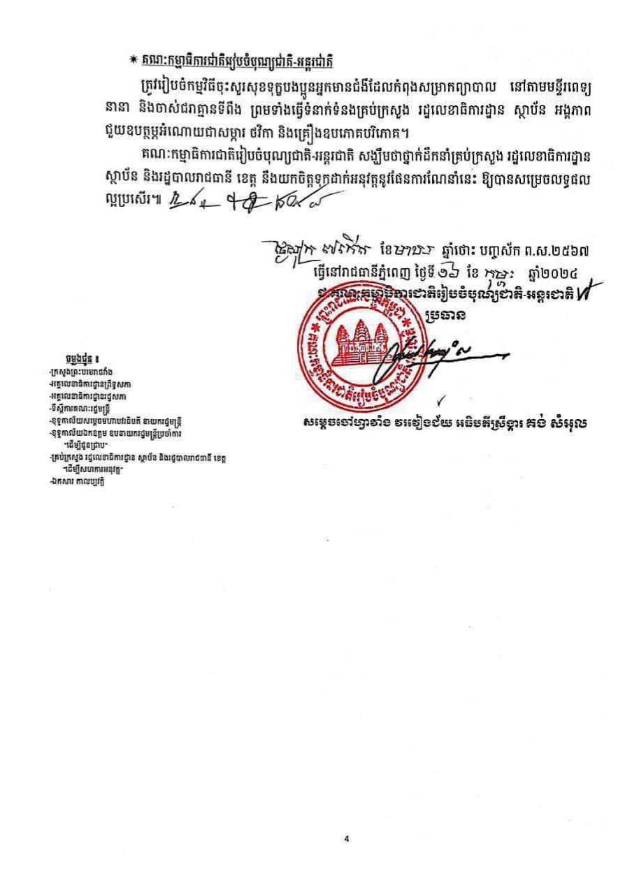 គណៈកម្មាធិការជាតិបញ្ជាក់ថា ពិធីបុណ្យចូលឆ្នាំថ្មី ឆ្នាំរោង ឆស័ក ព.ស.២៥៦៨ គ.ស.២០២៤ នឹងប្រព្រឹត្តិតាមដំណើរសង្ក្រាន្ត រយៈពេល៤ថ្ងៃរាប់ចាប់ពីថ្ងៃសៅរ៍ទី១៣ វេលាម៉ោង ២២:១៧ នាទីយប់ ដល់ថ្ងៃអង្គារ ទី១៦ ខែមេសា ឆ្នាំ២០២៤ គម្រប់សង្ក្រាន្ត៤ថ្ងៃចប់ដោយបរិបូណ៌ចូលឆ្នាំរោងឆស័កតរៀងទៅ។ ទោះជាយ៉ាងណាជុំវិញការរៀបចំពិធីបុណ្យប្រពៃណីជាតិនេះ គណៈកម្មាធិការជាតិ សង្កត់ធ្ងន់ថា ក្នុងដំណើរការពិធីបុណ្យប្រពៃណីជាតិនេះអង្គភាពពាក់ព័ន្ធ និងរដ្ឋបាលរាជធានី ខេត្តត្រូវរៀបចំចាត់តាំងឱ្យមានការលេងល្បែងប្រជាប្រិយរបស់ជាតិ។ ល្បែងប្រជាប្រិយរបស់ជាតិទាំងនោះរួមមាន៖ ចោលឈូង បោះអង្គញ់ ទាញព្រ័ត្រ ទាត់សី លាក់កន្សែង រាំកម្សាន្ត តាមមណ្ឌលកម្សាន្ត តាមរមណីយដ្ឋាននានា ឬទីតាំងណាដែលសមគួរ ផ្ទុយទៅវិញត្រូវជៀសវាង និងទប់ស្កាត់ឱ្យបាននូវល្បែងណាដែលប្រាសចាកនឹងច្បាប់ ខុសប្រពៃណីជាតិ ដូចជា ល្បែងស៊ីសង ល្បែងជះទឹក លាបធ្យូង និងគ្រឿងផ្ទុះផ្សេងៗ។ល។