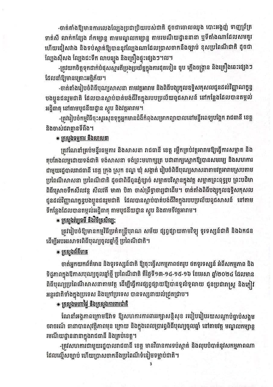 ស្ថាប័នដដែលបន្ថែមថា អ្នកពាក់ព័ន្ធទាំងអស់ត្រូវយកចិត្តទុកដាក់បំផុសស្មារតីប្រុងប្រយ័ត្នក្នុងការដុតទៀន ធូប ភ្លើងចង្ក្រាន និងគ្រឿងឆេះផ្សេងៗ ដែលនាំឱ្យមានគ្រោះអគ្គិភ័យជាយថាហេតុ។ ជាមួយគ្នានេះ អាជ្ញាធរត្រូវចុះណែនាំ ម្ចាស់រោងចក្រ សហគ្រាស សាលារៀនឯកជន មណ្ឌលកម្សាន្ត រមណីយដ្ឋាននានា ឱ្យតុបតែងលម្អដោយទង់ជាតិ ទង់សាសនា ទង់ព្រះមហាក្សត្រ បដាពាក្យស្លោក និងដុតគោម បំភ្លឺភ្លើងពណ៌ ដើម្បីអបអរសាទរពិធីបុណ្យចូលឆ្នាំថ្មី ប្រពៃណីជាតិយើង។ ជាងនេះទៅទៀត អាជ្ញាធរ ត្រូវសហការការពាររក្សាសន្តិសុខ សុវត្ថិភាព សណ្ដាប់ធ្នាប់សង្គម ជួយសម្រួលចរាចរណ៍គ្រប់ទីកន្លែង ព្រមទាំងបង្កលក្ខណៈល្អប្រសើរ តាមមណ្ឌលកម្សាន្ត និងរមណីយដ្ឋាននានាជូនប្រជាពលរដ្ឋ ភ្ញៀវជាតិ- អន្តរជាតិ ចូលរួមកម្សាន្តសប្បាយ។