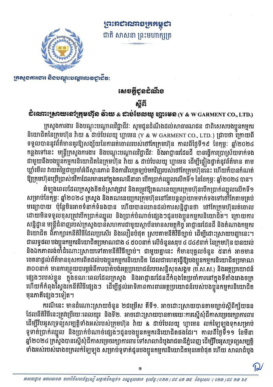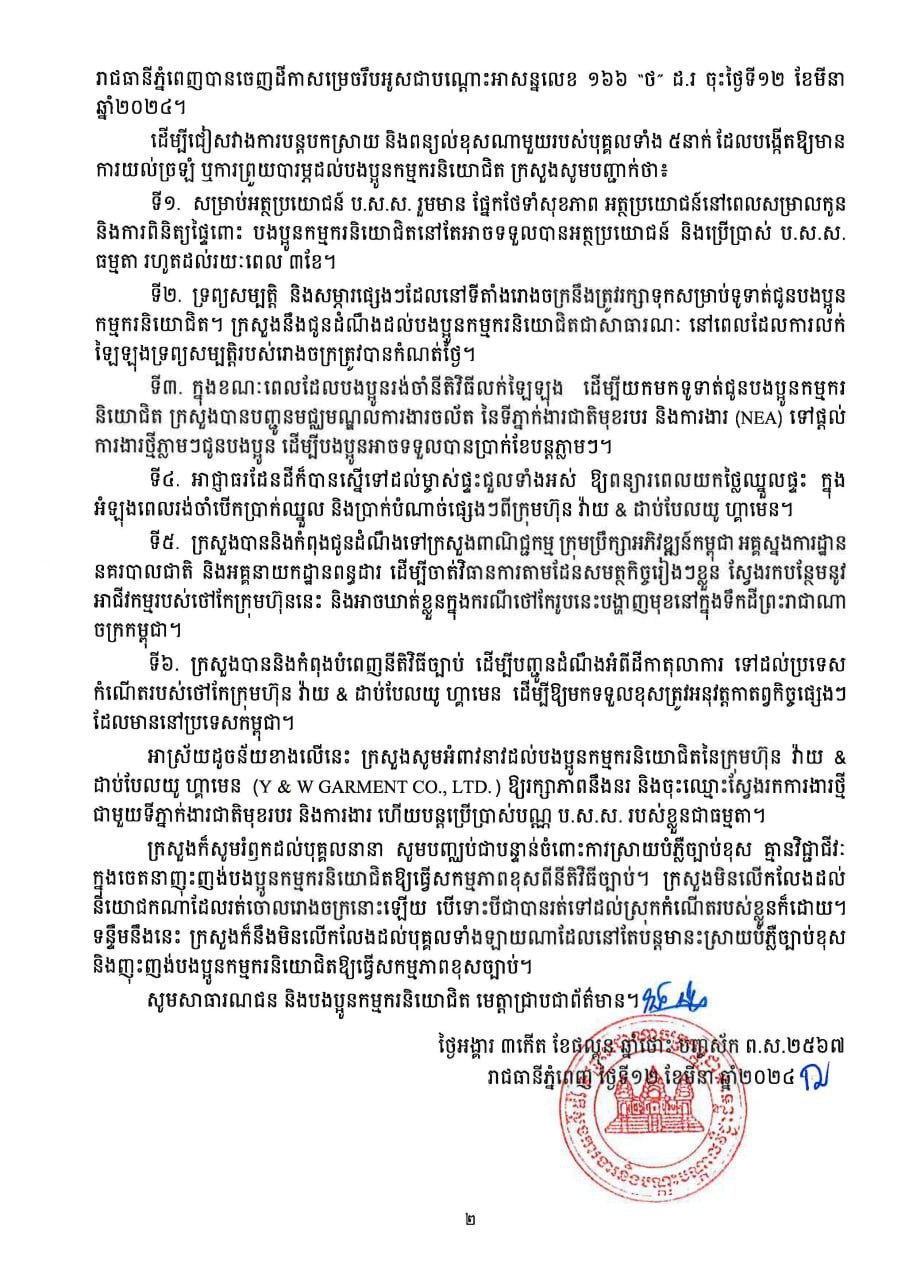 រាជធានីភ្នំពេញ៖ ក្រសួងការងារ និងបណ្ដុះបណ្តាលវជ្ជជីវៈ កាលពីថ្ងៃទី១២មីនា បានជូនដំណឹងជាលើកទី២ ដោយបង្ហាញពីដំណោះស្រាយថ្មី ក្រោយសាលាដំបូងរាជធានីភ្នំពេញ ចេញដីការរឹបអូសជាបណ្តោះអាសន្ន នូវទ្រព្យសម្បត្តិរបស់រោងចក្រ វ៉ាយ & ដាប់បែលយូ ហ្គាមេន (Y&W Garment) តាមការប្តឹងរបស់ក្រសួង ដើម្បីយកលក់ឡៃឡុងទូទាត់ប្រាក់ជូនកម្មករ និយោជិតនៃក្រុមហ៊ុន ។