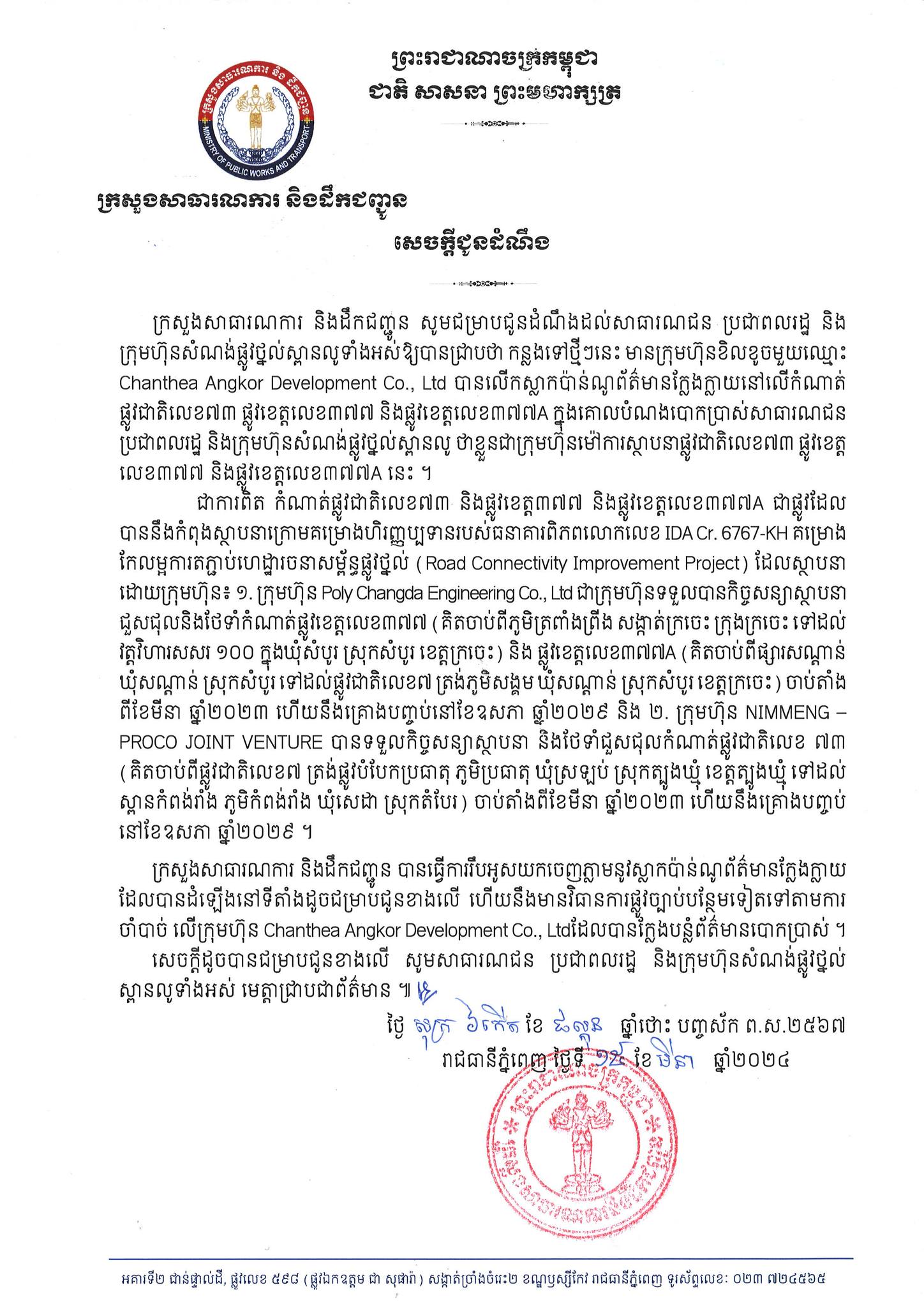 ក្រសួងសាធារណការ និងដឹកជញ្ជូន បានគូសបញ្ជាក់ថា កន្លងទៅថ្មីៗនេះមានក្រុមហ៊ុនខិលខូចមួយឈ្មោះ Chanthea Angkor Development Co., Ltd បានលើកស្លាកប៉ាន់ណូព័ត៌មានក្លែងក្លាយនៅលើកំណាត់ផ្លូវជាតិលេខ៧៣ ផ្លូវខេត្តលេខ៣៧៧ និងផ្លូវខេត្តលេខ៣៧៧A ក្នុងគោលបំណងបោកប្រាស់សាធារណជន ប្រជាពលរដ្ឋ និងក្រុមហ៊ុនសំណង់ផ្លូវថ្នល់ស្ពានលូថា ខ្លួនជាក្រុមហ៊ុនម៉ៅការស្ថាបនាផ្លូវជាតិលេខ៧៣ ផ្លូវខេត្ត លេខ៣៧៧ និងផ្លូវខេត្តលេខ៣៧៧A នេះ។ ក្រសួងសង្កត់ថា ជាការពិតផ្លូវខាងលើបាននឹងកំពុងស្ថាបនាក្រោមគម្រោងហិរញ្ញប្បទានរបស់ធនាគារពិភពលោកលេខ IDA Cr. 6767-KH គម្រោងកែលម្អការតភ្ជាប់ហេដ្ឋារចនាសម្ព័ន្ធផ្លូវថ្នល់ (Road Connectivity Improvement Project) ដែលស្ថាបនា ដោយក្រុមហ៊ុនចំនួន២។