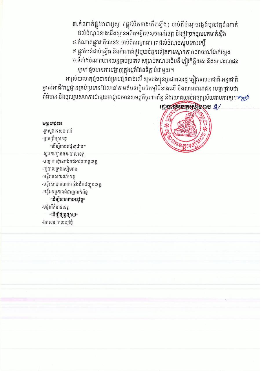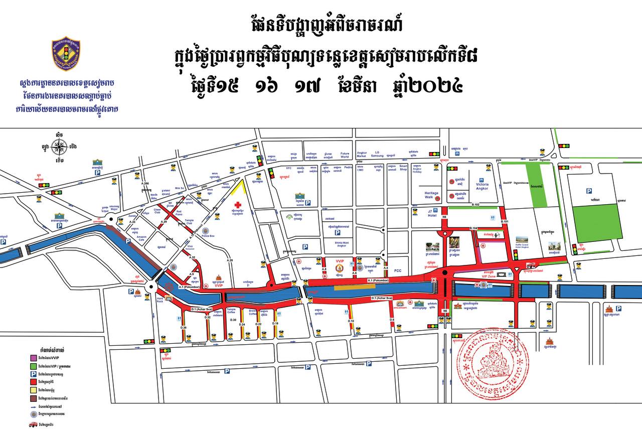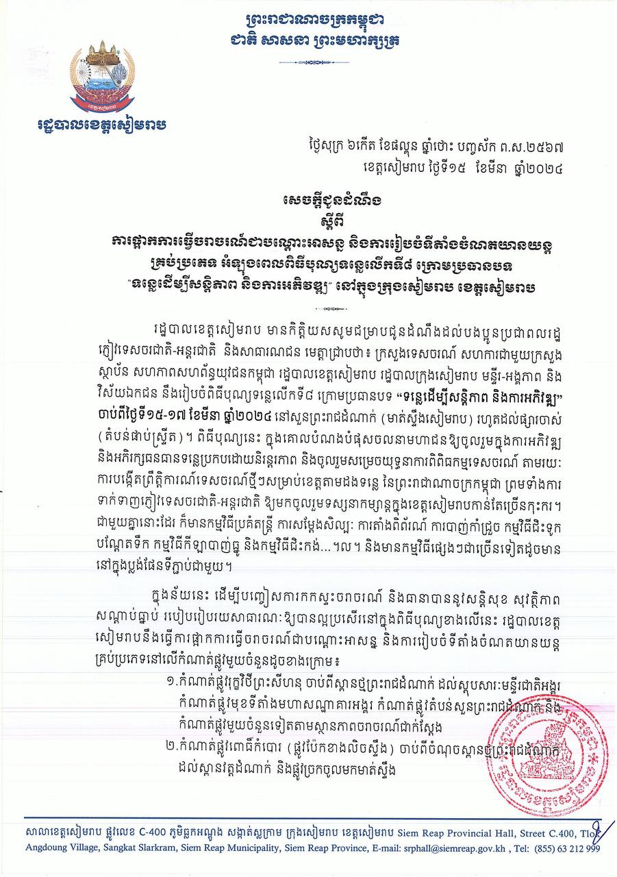 រដ្ឋបាលខេត្តបញ្ជាក់ថា៖«ដើម្បីបញ្ចៀសការកកស្ទះចរាចរណ៍ និងធានាបាននូវសន្តិសុខ សុវត្ថិភាព សណ្តាប់ធ្នាប់ របៀបរៀបរយសាធារណៈ ឱ្យបានល្អប្រសើរនៅក្នុងពិធីបុណ្យខាងលើនេះ រដ្ឋបាលខេត្តសៀមរាបនឹងធ្វើការផ្អាកការធ្វើចរាចរណ៍ជាបណ្តោះអាសន្ន និងការរៀបចំទីតាំងចំណតយានយន្តគ្រប់ប្រភេទនៅលើកំណាត់ផ្លូវមួយចំនួនក្នុងខេត្ត»។ ផ្លូវទាំងនោះរួមមាន៖ទី១.កំណាត់ផ្លូវរុក្ខវិថីព្រះសីហនុ (ចាប់ពីស្ពានថ្មព្រះរាជដំណាក់ ដល់ស្តុបសារមន្ទីរជាតិអង្គរ) កំណាត់ផ្លូវមុខទីតាំងមហាសណ្ឋាគារអង្គរ កំណាត់ផ្លូវតំបន់សួនព្រះរាជដំណាក់ និងកំណាត់ផ្លូវមួយចំនួនទៀតតាមស្ថានភាពចរាចរណ៍ជាក់ស្តែង។ ទី២.កំណាត់ផ្លូវពោធិ៍កំបោរ (ផ្លូវប៉ែកខាងលិចស្ទឹង) ចាប់ពីចំណុចស្ពានថ្មព្រះរាជដំណាក់ ដល់ស្ពានវត្តដំណាក់ និងផ្លូវច្រកចូលមកមាត់ស្ទឹង។ ទី៣.កំណាត់ផ្លូវអាចារ្យស្វា(ផ្លូវប៉ែកខាងកើតស្ទឹង) ចាប់ពីចំណុចរង្វង់មូលវត្តដំណាក់ ដល់ចំណុចខាងជើងស្ពានអតីតមន្ទីរទេសចរណ៍ខេត្ត និងផ្លូវច្រកចូលមកមាត់ស្ទឹង។ ទី៤.កំណាត់ផ្លូវជាតិលេខ៦ ចាប់ពីសណ្ឋាគារ J7 ដល់ចំណុចស្តុបកោះកេរ្តិ៍។ ទី៥.ផ្លូវតំបន់ផាប់ស្ទ្រីត និងកំណាត់ផ្លូវមួយចំនួនទៀតតាមស្ថានភាពចរាចរណ៍ជាក់ស្តែង។ ចំពោះមុខនៃការបិទផ្អាកកំណាត់ផ្លូវមួយចំនួនមិនឱ្យចរាចរណ៍ អាជ្ញាធរ ក៏បានបង្ហាញពីផែនទីចំណត់ភ្ជាប់ជាមួយសេចក្តីជូនដំណឹងផងដែរ ដោយទីតាំងចំណតយានយន្តគ្រប់ប្រភេទនោះសម្រាប់គណៈអធិបតី ភ្ញៀវកិត្តិយស និងសាធារណជនទូទៅចូលចត។
