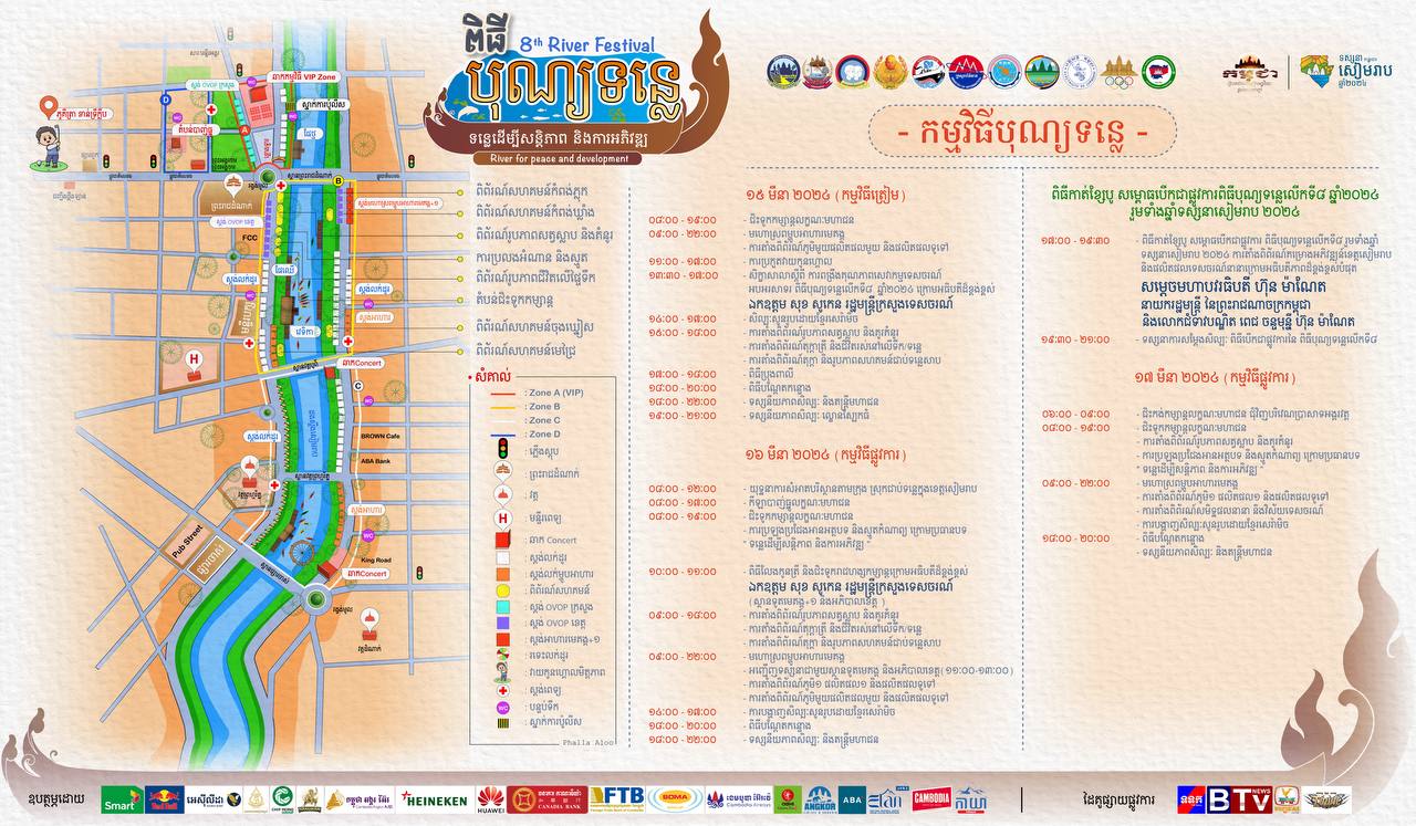 សូមជម្រាបថា ពិធីបុណ្យទន្លេលើកទី៨ ក្រោមប្រធានបទ«ទន្លេដើម្បីសន្តិភាព និងការអភិវឌ្ឍ» នឹងរៀបចំឡើង ចាប់ពីថ្ងៃទី១៥ ដល់ថ្ងៃទី១៧ ខែមីនា ឆ្នាំ២០២៤ នៅសួនព្រះរាជដំណាក់ (មាត់ស្ទឹងសៀមរាប) រហូតដល់ផ្សារចាស់ (តំបន់ផាប់ស្ទ្រីត)។ ពិធីបុណ្យនេះ រៀបចំឡើងក្នុងគោលបំណងបំផុសចលនាមហាជនឱ្យចូលរួមក្នុងការអភិវឌ្ឍ និងអភិរក្សធនធានទន្លេប្រកបដោយនិរន្តរភាព និងចូលរួមសម្រេចយុទ្ធនាការពិពិធកម្មទេសចរណ៍ តាមរយៈការបង្កើតព្រឹត្តិការណ៍ទេសចរណ៍ថ្មីៗសម្រាប់ខេត្តតាមដងទន្លេ នៃព្រះរាជាណាចក្រកម្ពុជា ព្រមទាំងការ ទាក់ទាញភ្ញៀវទេសចរជាតិ-អន្តរជាតិ ឱ្យមកចូលរួមទស្សនាកម្សាន្តក្នុងខេត្តសៀមរាបកាន់តែច្រើនកុះករ។ ជាមួយគ្នានោះ ក៏មានកម្មវិធីប្រគំតន្ត្រី ការសម្តែងសិល្បៈ ការតាំងពិពណ៌ ការបាញ់កាំជ្រួច កម្មវិធីជិះទូក បណ្តែតទឹក កម្មវិធីកីឡាបាញ់ធ្នូ និងកម្មវិធីជិះកង់ និងមានកម្មវិធីផ្សេងៗជាច្រើនទៀត។ល។