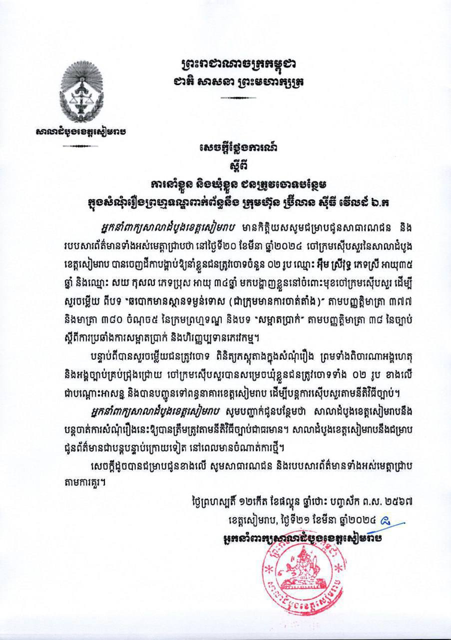 អ្នកនាំពាក្យអយ្យការអមសាលាដំបូងខេត្តសៀមរាប បញ្ជាក់ថាកាលពីថ្ងៃទី២០ ខែមីនា ឆ្នាំ២០២៤ ចៅក្រមស៊ើបសួរនៃសាលាដំបូងខេត្តសៀមរាប បានចេញដីកាបង្គាប់ឱ្យនាំខ្លួនជនត្រូវចោទ២នាក់បន្ថែមទៀត ពាក់ព័ន្ធសំណុំរឿងព្រហ្មទណ្ឌនោះ។ ជនត្រូវចោតទាំងពីរនាក់រួមមាន៖ ឈ្មោះ អ៊ឹម ស្រីវុទ្ធ ភេទស្រី អាយុ៣៥ឆ្នាំ និងឈ្មោះ សយ កុសល ភេទប្រុស អាយុ៣៤ឆ្នាំមកបង្ហាញខ្លួននៅចំពោះមុខចៅក្រមស៊ើបសួរ ដើម្បីសួរចម្លើយពីបទ «ឆបោកមានស្ថានទម្ងន់ទោស[ជាក្រុមមានការចាត់តាំង]» និងបទ «សម្អាតប្រាក់»។ អ្នកនាំពាក្យបន្ថែមថា ក្រោយសួរចម្លើយជនត្រូវចោទ និងពិនិត្យភស្តុតាងក្នុងសំណុំរឿង ចៅក្រមស៊ើបសួរសម្រេចឃុំខ្លួនជនត្រូវចោទទាំង២រូបជាបណ្តោះអាសន្ន និងបានបញ្ជូនទៅពន្ធនាគារខេត្តសៀមរាប ដើម្បីបន្តស៊ើបសួរតាមនីតិវិធីច្បាប់។ ជាមួយគ្នានោះ សាលាដំបូងខេត្តសៀមរាបនឹងបន្តចាត់ការសំណុំរឿងនេះឱ្យបានត្រឹមត្រូវតាមនីតិវិធីច្បាប់ជាធរមាន។