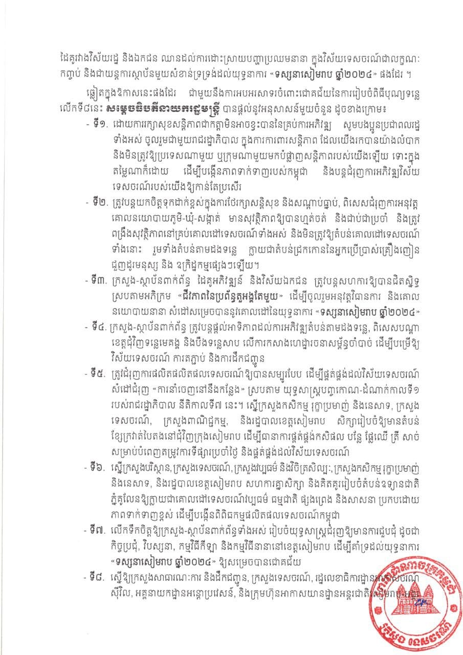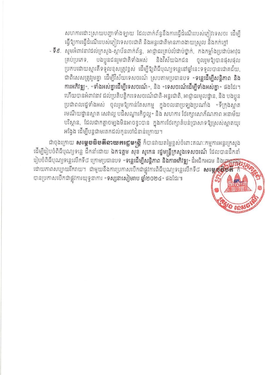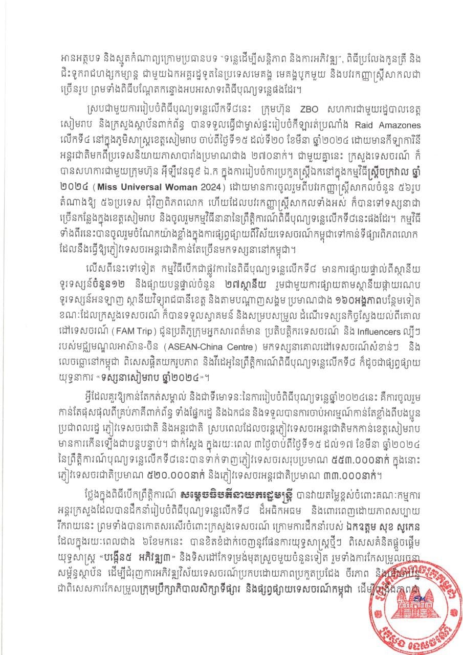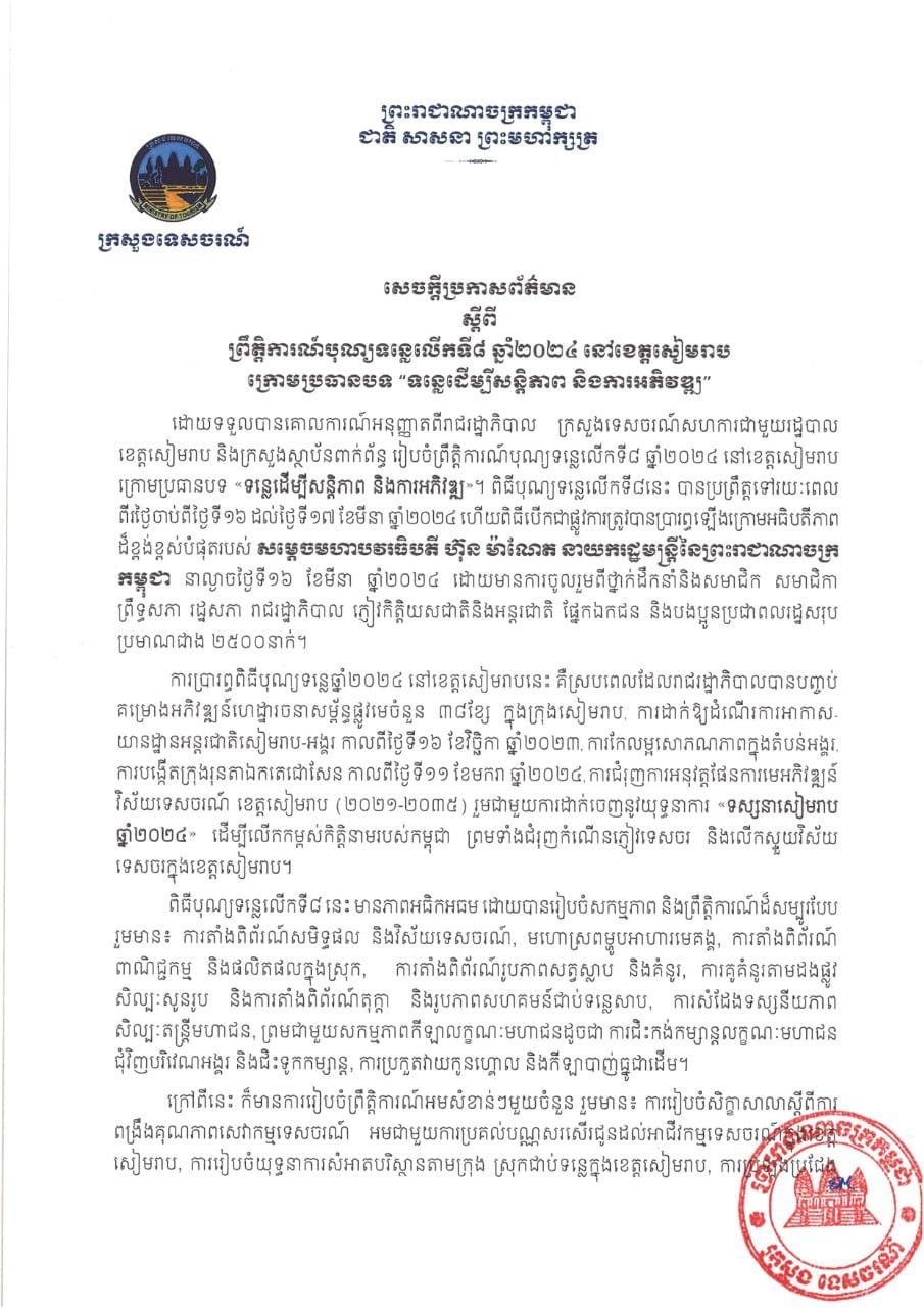 រាជធានីភ្នំពេញ៖ ក្រោយបញ្ចប់ពិធីបុណ្យទន្លេលើកទី៨ ក្រោមប្រធានបទ «ទន្លេដើម្បីសន្តិភាព និងការអភិវឌ្ឍ» នៅខេត្តសៀរា អស់រយៈពេល៨ថ្ងៃ ក្រសួងទេចរណ៍កម្ពុជា នៅថ្ងៃទី២៥ ខែមីនា ឆ្នាំ២០២៤នេះ បានចេញសេចក្តីប្រកាសព័ត៌មានរួមទាក់ទងជាមួយការរៀបចំកម្មវិធី និងសមិទ្ធផលដែលទទួលបាន...។