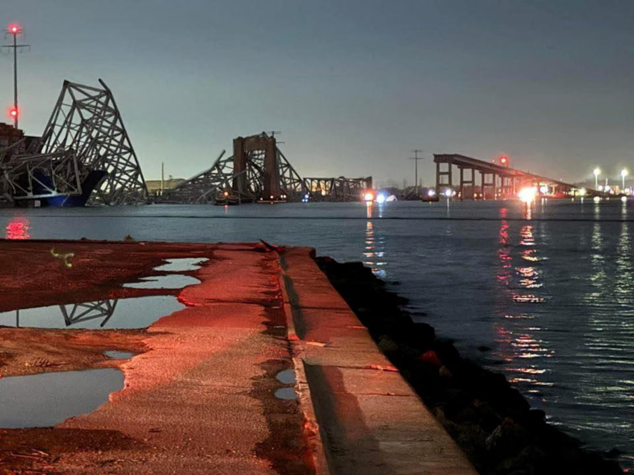ឆ្មាំឆ្នេរសមុទ្រអាម៉េរិក និងមន្ត្រីប៉ូលិសរដ្ឋម៉ារីឡែន បាននិយាយថា ដោយផ្អែកលើសីតុណ្ហភាពត្រជាក់នៃទឹក និងរយៈពេលដែលបានកន្លងផុតទៅចាប់តាំងពីស្ពានបានធ្លាក់ចុះមក មានឱកាសតិចតួចណាស់ដែលថា អ្នកបាត់ខ្លួនទាំង៦នាក់អាចត្រូវបានរកឃើញនៅរស់។ នាវាដឹកកុងតឺន័រដែលមានទង់ជាតិសិង្ហបុរីឈ្មោះ ដាលី ធ្វើដំណើរចេញពីកំពង់ផែដែលភ្ជាប់ទៅនឹងប្រទេសស្រីលង្កា បានបុកបង្គោលស្ពាន Francis Scott Key នៅលើមាត់ទន្លេ Patapsco នៅម៉ោងប្រហែល១ៈ៣០ទៀបភ្លឺ (ម៉ោងនៅរដ្ឋម៉ារីឡែន)។ នាវាបានបាត់បង់ថាមពលមួយភ្លែត មុនពេលវាបុកស្ពាន។