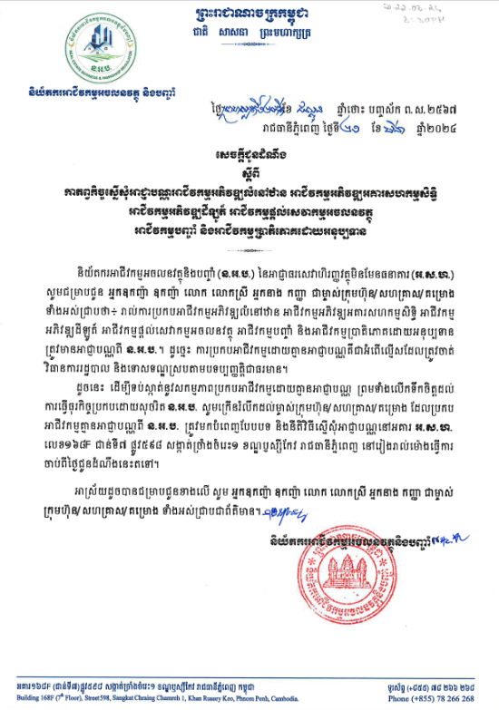 ដូចនេះ ដើម្បីទប់ស្កាត់នូវសកម្មភាពប្រកបអាជីវកម្មដោយគ្មានអាជ្ញាបណ្ណ ព្រមទាំងលើកទឹកចិត្តដល់ការធ្វើធុរកិច្ចប្រកបដោយសុចរិត ន.អ.ប. សូមក្រើនរំលឹកដល់ម្ចាស់ក្រុមហ៊ុន/សហគ្រាស/គម្រោង ដែលប្រកបអាជីវកម្មគ្មានអាជ្ញាបណ្ណពី ន.អ.ប. ត្រូវមកបំពេញបែបបទ និងនីតិវិធីស្នើសុំអាជ្ញាបណ្ណនៅអគារ អ.ស.ហ. លេខ១៦៨ ជាន់ទី៧ ផ្លូវ៥៩៨ សង្កាត់ច្រាំងចំរេះ១ ខណ្ឌឫស្សីកែវ រាជធានីភ្នំពេញ នៅរៀងរាល់ម៉ោងធ្វើការ ចាប់ពីថ្ងៃជូនដំណឹងនេះតទៅ។អាស្រ័យដូចបានជម្រាបជូនខាងលើ សូម អ្នកឧកញ៉ា ឧកញ៉ា លោក លោកស្រី អ្នកនាងកញ្ញា ជាម្ចាស់ក្រុមហ៊ុន/សហគ្រាស/គម្រោងទាំងអស់ជ្រាបជាព័ត៌មាន...៕