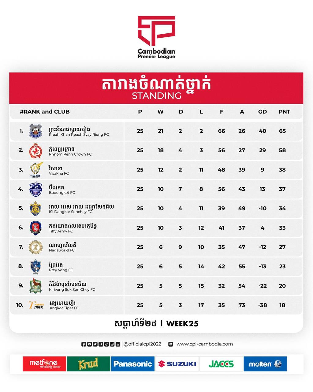 គួរឱ្យដឹងដែរថា គិតត្រឹម២៥សប្តាហ៍ ក្លឹបព្រះខ័នរាជស្វាយរៀង ឆ្លងកាត់ការធ្វើសឹកសង្គ្រាមលើសមរភូមិវាលស្មៅ២៥ប្រកួតកន្លងមកនេះ ទទួលបានជ័យជម្នះ២១លើក ស្មើ២លើក និងចាញ់២លើក រកបាន៦៥ពិន្ទុ និងកំពុងឈរលើកំពូលតារាងដ៏រឹងមាំ។ មែនទែនទៅ ព្រះខ័នរាជស្វាយរៀង អាចនិយាយបានថាជាក្រុមដែលល្អបំផុតនៅក្នុងរដូវកាលនេះ ក៏ប៉ុន្តែមិនទាន់ល្អឥតខ្ចោះនោះឡើយ គឺទទួលបានជ័យជម្នះ៩លើកជាប់គ្នាក្នុងជុំទី១ ប៉ុន្តែចូលជុំទី២ពួកគេហាក់ធ្លាក់ទម្រង់លេងបន្តិច ដោយបានចាញ់២ដង ស្មើ២ដង ខណៈជុំទី៣ ពួកគេកំពុងធ្វើដំណើរយ៉ាងល្អដោយមិនទាន់ស្គាល់បរាជ័យឡើយ។