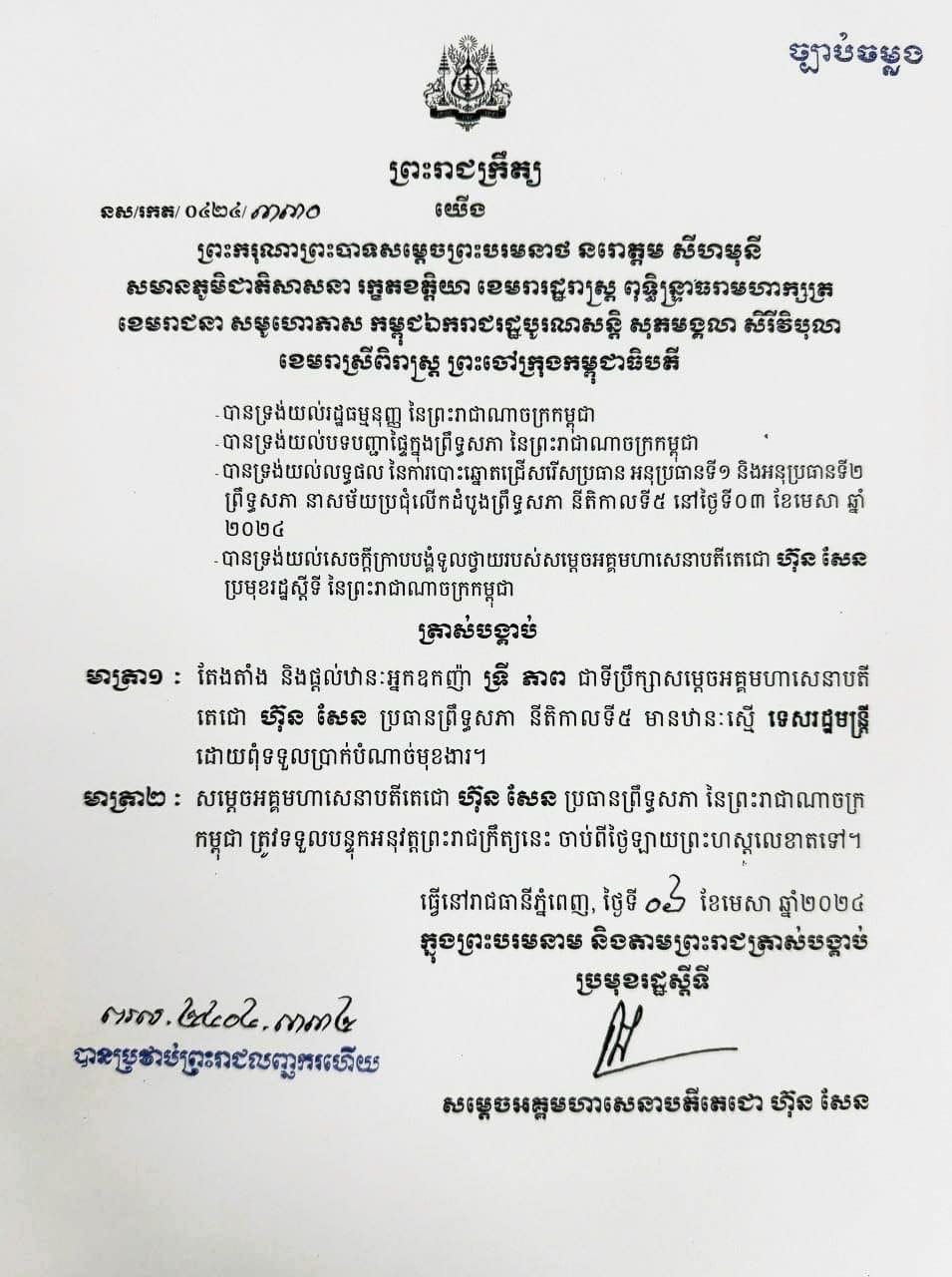 ព្រះរាជក្រឹត្យ ដែលបានចុះហត្ថលេខាដោយប្រមុខរដ្ឋស្តីទីនៅថ្ងៃសៅរ៍នេះ បានត្រាស់បង្គាប់តែងតាំង និងផ្ដល់ឋានៈអ្នកឧកញ៉ា ទ្រី ភាព ជាទីប្រឹក្សាសម្តេចតេជោ ហ៊ុន សែន ប្រធានព្រឹទ្ធសភា នីតិកាលទី៥ មានឋានៈស្មើទេសរដ្ឋមន្ត្រី ដោយពុំទទួលបានប្រាក់បំណាច់មុខងារ។ ប្រធានព្រឹទ្ធសភា ត្រូវទទួលបន្ទុកអនុវត្តព្រះរាជក្រឹត្យនេះ ចាប់ពីថ្ងៃឡាយព្រះហស្ដលេខាតទៅ។ គួររំឭកថា កាលពីថ្ងៃទី១៤ ខែសីហា ឆ្នាំ២០០៤ ប្រមុខរដ្ឋស្ដីទី គឺកាលនោះជាសម្តេច ជា ស៊ីម បានចុះហត្ថលេខាលើព្រះរាជក្រឹត្យតែងតាំង លោក ទ្រី ភាព ដែលជាឈ្មួញឈើដ៏ល្បីជា «ឧកញ៉ា»។ ក្រោយមកនៅ ថ្ងៃទី០៨ ខែធ្នូ ឆ្នាំ២០២១ ព្រះករុណាព្រះបាទសម្តេច ព្រះបរមនាថ នរោត្តម សីហមុនី ព្រះមហាក្សត្រនៃព្រះរាជាណាចក្រកម្ពុជា ទ្រង់ត្រាស់បង្គាប់ផ្តល់គោរមងារជា «អ្នកឧកញ៉ា» ដល់ឧកញ៉ា ទ្រី ភាព ដែលជាអគ្គនាយកក្រុមហ៊ុន MDS Group ក្រុមហ៊ុន Try Pheap Import Export រួមទាំងក្រុមហ៊ុនច្រើនទៀត ពិសេសក្រុមហ៊ុនរកស៊ីលើវិស័យរ៉ែ និងបានទទួលដីសម្បទានសេដ្ឋកិច្ច និងតំបន់សេដ្ឋកិច្ចពិសេស ពីរាជរដ្ឋាភិបាលផងដែរ។