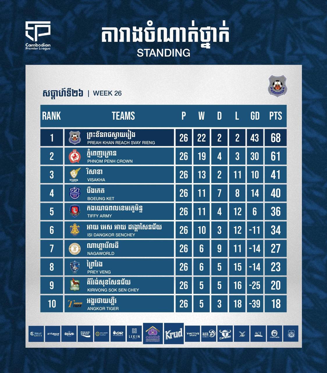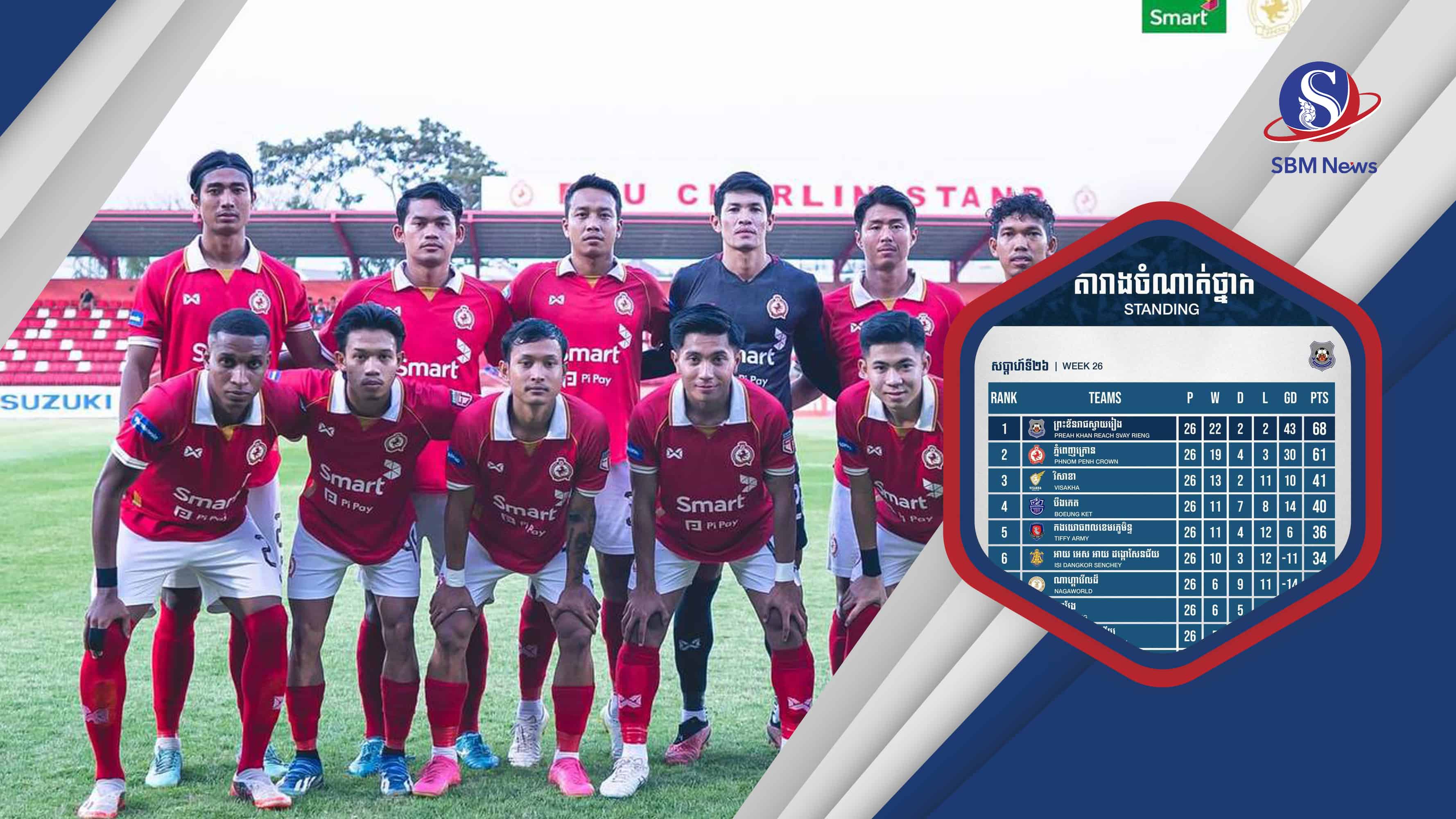 លីគកំពូលកម្ពុជា៖ ក្រោយការប្រកួតសប្តាហ៍ទី២៦ត្រូវបានបញ្ចប់នៃក្របខណ្ឌលីគកំពូលកម្ពុជា ក្រុមព្រះខ័នរាជស្វាយរៀង នៅតែបន្តនាំមុខភ្នំពេញក្រោន៧ពិន្ទុដដែល ពោលគឺព្រះខ័នរាជស្វាយរៀងត្រូវការតែ៦ពិន្ទុទៀតប៉ុណ្ណោះ ដើម្បីក្លាយជាជើងឯករដូវកាលនេះ បើទោះបីជាភ្នំពេញក្រោនឈ្នះទាំង៤ប្រកួតចុងក្រោយក៏ដោយ...។