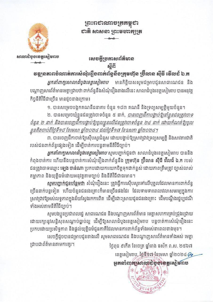 អ្នកនាំពាក្យសាលាដំបូងខេត្តសៀមរាប បានបញ្ជាក់ថា វឌ្ឍនភាពចំណាត់ការសំណុំរឿងនេះ សាលាដំបូងខេត្តសៀមរាប បានអនុវត្តកិច្ចនីតិវិធីជាច្រើនរួមមាន៖ សម្រេចបង្កកគណនីធនាគារចំនួន១៨៣គណនី និងទ្រព្យសម្បត្តិមួយចំនួន។ សាលាដំបូងខេត្តសៀមរាប សម្រេចឃុំខ្លួនជនត្រូវចោទចំនួន៥នាក់ និងបានចេញដីកាបង្គាប់ឱ្យនាំខ្លួនជនត្រូវចោទចំនួន២នាក់។ ទន្ទឹមគ្នានោះ តុលាការថាបានចេញដីកាបង្គាប់ឱ្យចូលខ្លួនលើជនត្រូវចោទចំនួន២៤នាក់ ដោយកំណត់ឱ្យចូលខ្លួនគិតចាប់ពីថ្ងៃទី១៨ ខែមេសា ឆ្នាំ២០២៤ ដល់ថ្ងៃទី១៧ ខែឧសភា ឆ្នាំ២០២៤។ បន្ថែមលើនេះ ស្ថាប័នដដែលអះអាងថា បានចេញដីកាចាត់ឱ្យស៊ើបសួរជំនួសដោយបង្គាប់ឱ្យស្រាវជ្រាវទ្រព្យសម្បត្តិ និងសាវតារជាតិរបស់ជនពាក់ព័ន្ធផ្សេងទៀត ដើម្បីចាត់ការបន្តតាមនីតិវិធីច្បាប់។