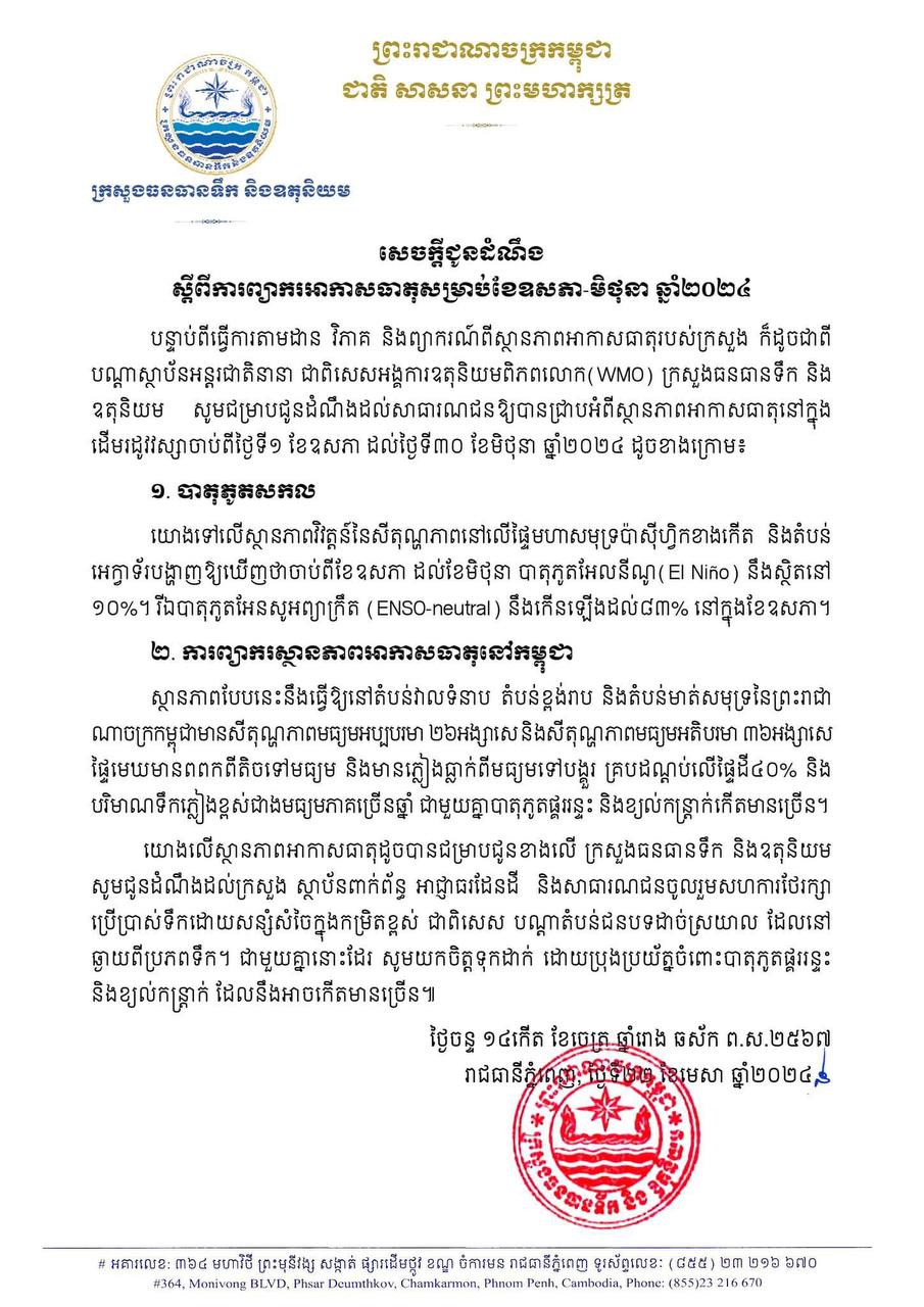 ក្រសួងបញ្ជាក់ថា បន្ទាប់ពីបានតាមដាន វិភាគ និងព្យាករពីស្ថានភាពអាកាសធាតុរបស់ក្រសួង ក៏ដូចជាពីបណ្តាស្ថាប័នអន្តរជាតិនានា ជាពិសេសអង្គការឧតុនិយមពិភពលោក(WMO) ឃើញថា ភាពវិវត្តន៍នៃសីតុណ្ហភាពនៅលើផ្ទៃមហាសមុទ្ទប៉ាស៊ីហ្វិកខាងកើត និងតំបន់អេក្វាទ័របង្ហាញឱ្យឃើញថា ចាប់ពីខែឧសភា ដល់ខែមិថុនា បាតុភូតអែលនីណូ (El Niño)នឹងស្ថិតនៅ១០ភាគរយ។ រីឯបាតុភូតអែនសូអព្យាក្រឹត (ENSO-neutral)នឹងកើនឡើងដល់៨៣ភាគរយនៅក្នុងខែឧសភា។ ហេតុនេះក្រសួងថា៖«តំបន់វាលទំនាប តំបន់ខ្ពង់រាប និងតំបន់មាត់សមុទ្ទនៃកម្ពុជា នឹងមានសីតុណ្ហភាពមធ្យមអប្បបរមា២៦អង្សាសេ និងសីតុណ្ហភាពមធ្យមអតិបរមា៣៦អង្សាសេ ផ្ទៃមេឃមានពពកពីតិចទៅមធ្យម និងមានភ្លៀងធ្លាក់ពីមធ្យមទៅបង្គួរ គ្របដណ្ដប់លើផ្ទៃដី៤០ភាគរយ[..]បាតុភូតផ្គររន្ទះ និងខ្យល់កន្ត្រាក់កើតមានច្រើន»។