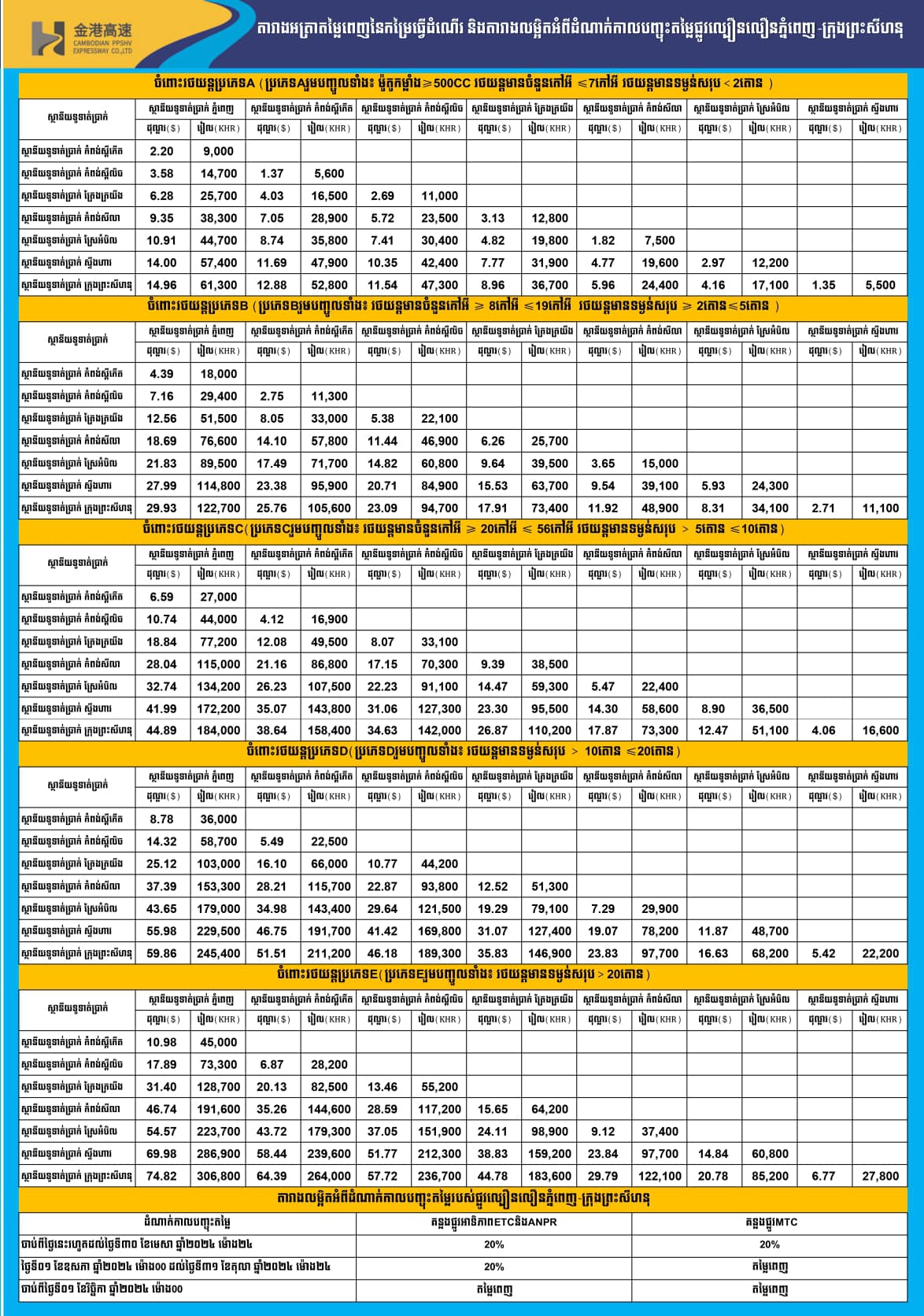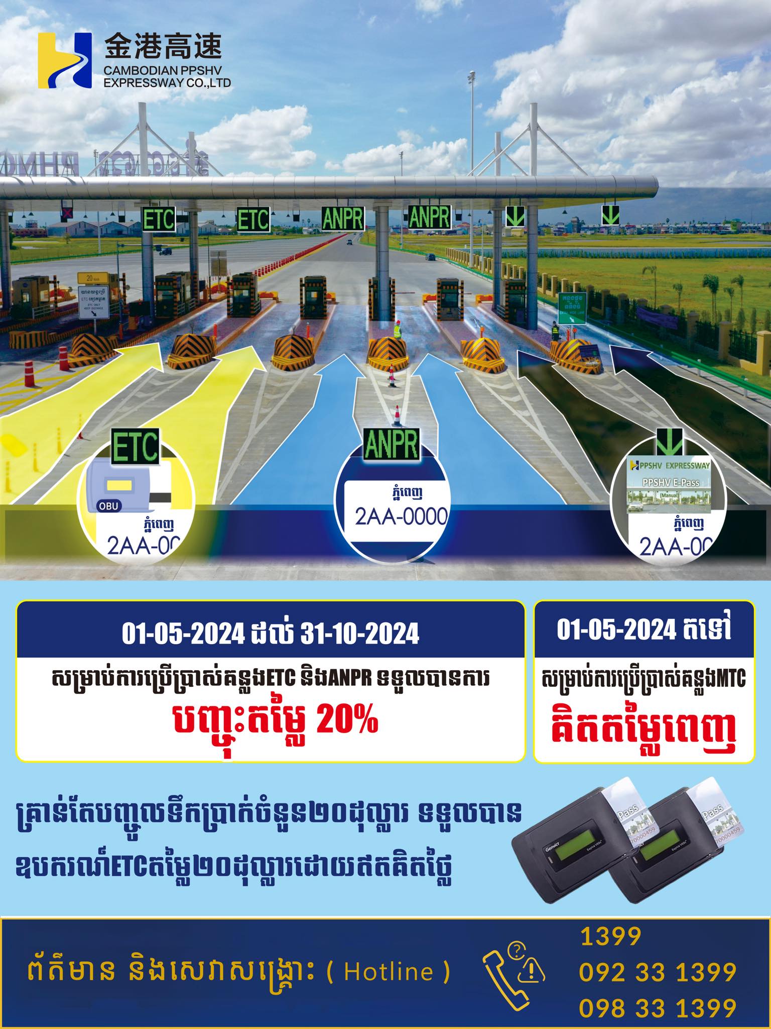 រាជធានីភ្នំពេញ៖ ក្រុមហ៊ុនផ្លូវល្បឿនលឿនភ្នំពេញ-ក្រុងព្រះសីហនុបានបញ្ជាក់ថា ការបញ្ចុះតម្លៃ២០ភាគរយសម្រាប់ថ្លៃធ្វើដំណើរផ្លូវល្បឿនលឿនភ្នំពេញ-ព្រះសីហនុ ដែលទូទាត់ជាសាច់ប្រាក់សុទ្ធ (MTC) នឹងបញ្ចប់នាចុងខែមេសានេះ ពោលគឺនឹងត្រឡប់តម្លៃសេវាធ្វើដំណើរមកតម្លៃដើមវិញចាប់ពីថ្ងៃទី១ ខែឧសភា ឆ្នាំ២០២៤ វេលាម៉ោង00:00នាទី។