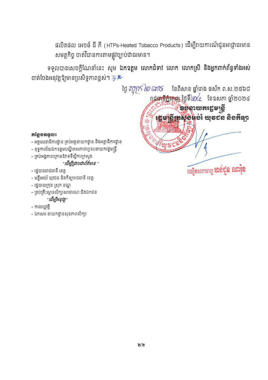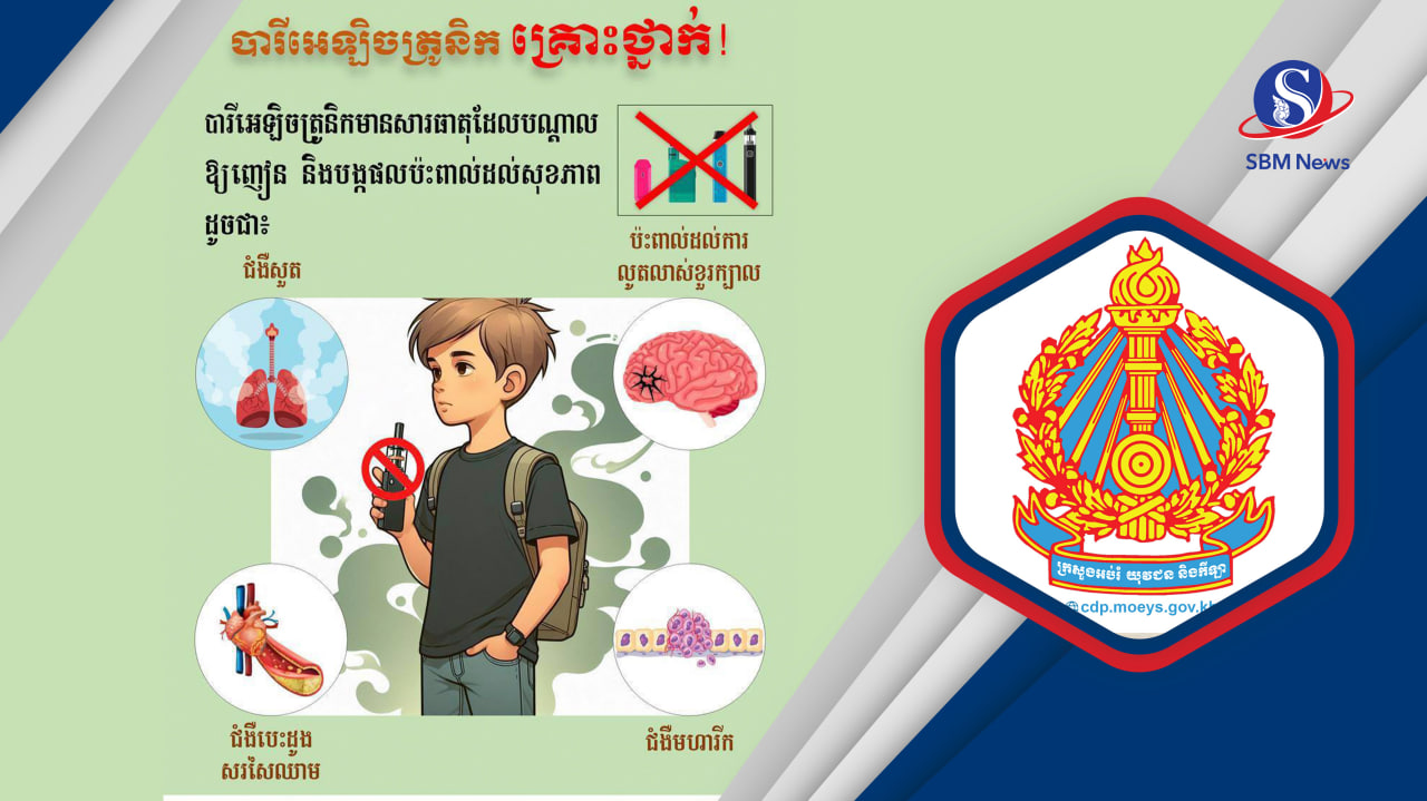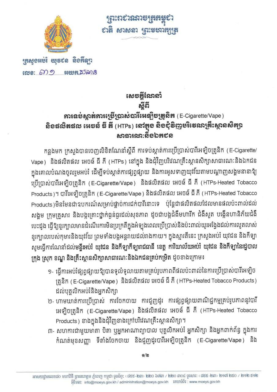 រាជធានីភ្នំពេញ៖ ក្រសួងអប់រំ យុវជន និងកីឡា នៅថ្ងៃទី២៧ ខែឧសភា ឆ្នាំ២០២៤ នេះ បានចេញសេចក្តីណែនាំ ស្តីពីការទប់ស្កាត់ ការប្រើប្រាស់បារីអេឡិចត្រូនិក (E-Cigarette/Vape) និងផលិតផល អេចន៍ធីភី (HTPs) នៅតាមគ្រឹះស្ថានសិក្សាសាធារណៈ និងឯកជន…។