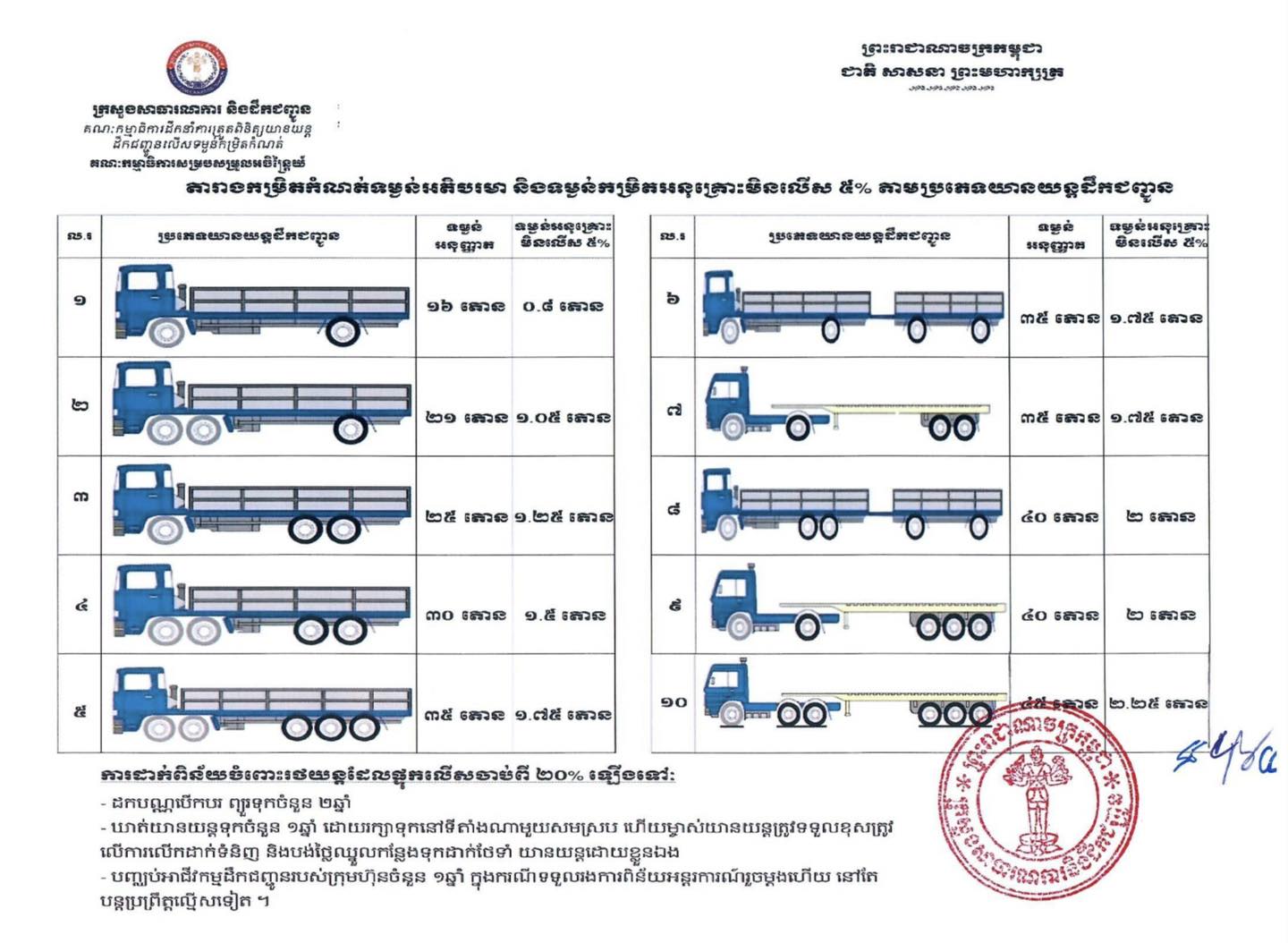 គួរជម្រាបថា ទម្ងន់ដឹកជញ្ជូនអតិបរមាលើបណ្តាញផ្លូវថ្នល់តាមប្រភេទយានយន្តត្រូវបានក្រសួងកំណត់រួមមាន៖ យានយន្ត២ភ្លៅ អនុញ្ញាតឱ្យដឹកបានទម្ងន់ ១៦តោន។ យានយន្តសណ្តោងរ៉ឺម៉ក ឬសណ្តោងសឺមីរ៉ឺម៉ក ដែលមាន៦ភ្លៅ ឡើងទៅ អាចដឹកបានទម្ងន់កំណត់ ៤៥តោន។ ចំពោះរថយន្តដែលផ្ទុកលើសចាប់ពី២០ភាគរយឡើងទៅនឹងត្រូវរងពិន័យ ដកបណ្ណបើកបរព្យួរទុកចំនួន២ឆ្នាំ ឃាត់យានយន្តទុក១ឆ្នាំ។ រក្សាទុកនៅទីតាំងណាមួយសមស្រប ហើយម្ចាស់យានយន្តត្រូវទទួលខុសត្រូវលើការលើកដាក់ទំនិញ និងបង់ថ្លៃឈ្នួលកន្លែងទុកដាក់ថែទាំ យានយន្តដោយខ្លួនឯង។ ឈានទៅបញ្ឈប់អាជីវកម្មដឹកជញ្ជូនរបស់ក្រុមហ៊ុន១ឆ្នាំ ក្នុងករណីទទួលរងការពិន័យអន្តរការណ៍ម្ដងរួចមកហើយ និងនៅតែបន្តប្រព្រឹត្តល្មើសទៀត៕