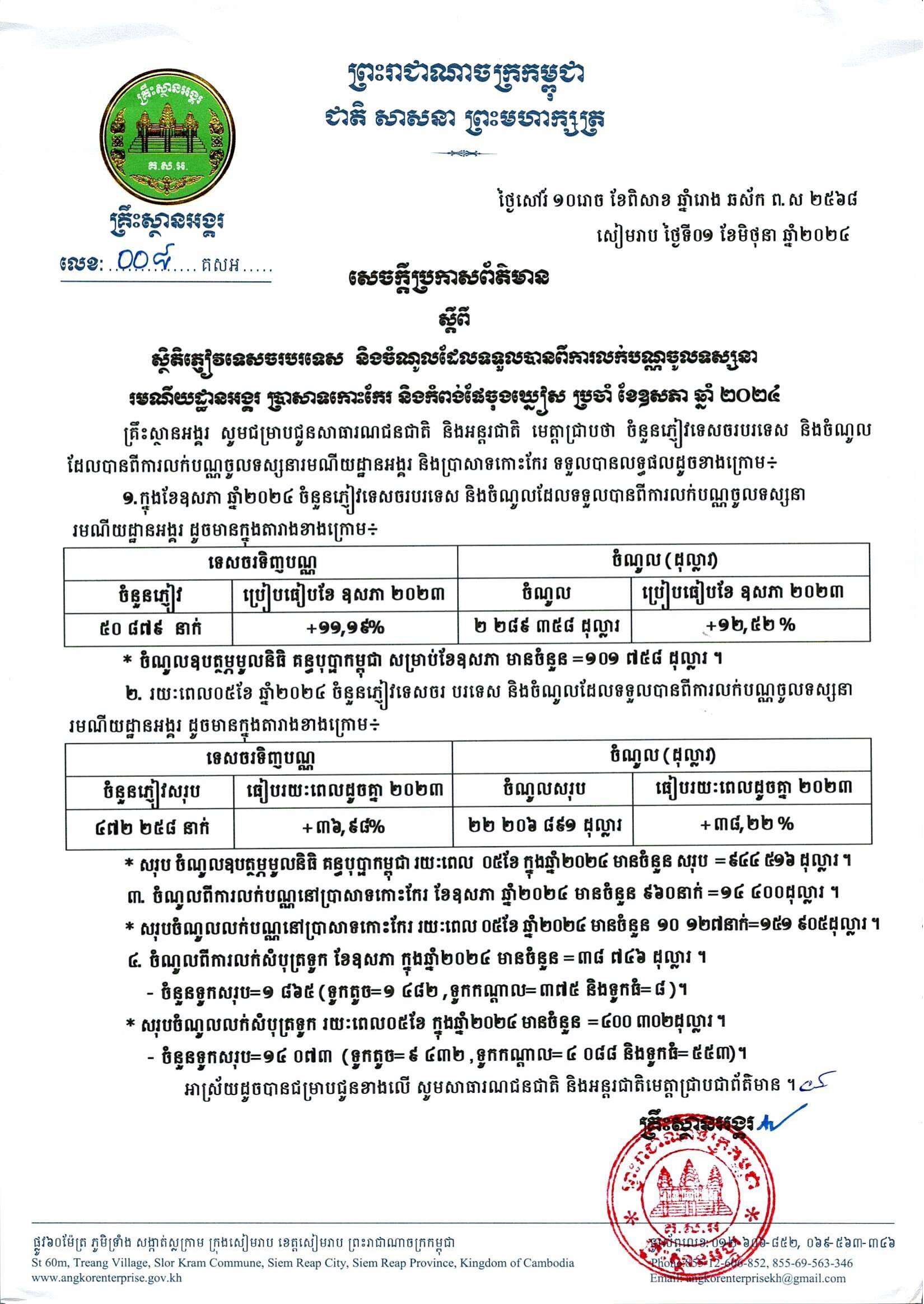 គ្រឹះស្ថានអង្គរបញ្ជាក់ថា ចាប់ពីខែមករា ដល់ខែឧសភា ឆ្នាំ២០២៤ ភ្ញៀវទេសចរបរទេសដែលទិញសំបុត្រចូលទស្សនារមណីយដ្ឋានអង្គរមានចំនួនសរុប៤៧២ ២៥៨នាក់ ពោលគឺកើនឡើង៣៦,៩៨ភាគរយ និងទទួលបានចំណូល ២២ ២០៦ ៨៩១ដុល្លារអាម៉េរិក កើនឡើង៣៨,២២ភាគរយ បើធៀបនឹងរយៈពេលដូចគ្នាក្នុងឆ្នាំ២០២៣។ ដោយឡែក សម្រាប់ខែឧសភា ឆ្នាំ២០២៤ គ្រឹះស្ថានអង្គររកចំណូលបាន ២ ២៨៩ ៣៥៨ដុល្លារអាម៉េរិក ពីការលក់បណ្ណជូនភ្ញៀវទេសចរចូលទស្សនារមណីយដ្ឋានអង្គរចំនួន៥០៨៧៩នាក់។