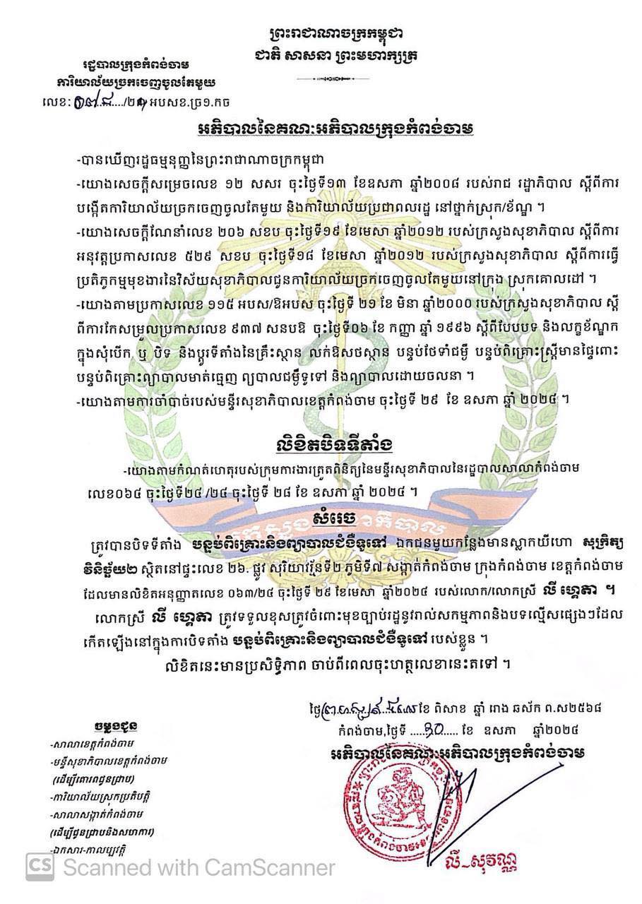 ក្រសួងអះអាថា ដោយយោងតាមអនុសាសន៍ណែនាំរបស់ ឯកឧត្ដមសាស្ត្រាចារ្យ ឈាង រ៉ា រដ្ឋមន្ត្រីក្រសួងសុខាភិបាល ក្រុមការងារការិយាល័យនិយ័តកម្មនៃមន្ទីរសុខាភិបាលខេត្ត បានចុះពិនិត្យបន្ទប់ពិគ្រោះ និងព្យាបាលជំងឺ «សុក្រិតវិនិច្ឆ័យ II» ដែលមានទីតាំងនៅផ្ទះលេខ២៦ ផ្លូវសុរិយាវរ្ម័នទី២ ភូមិ៧ សង្កាត់កំពង់ចាម ក្រុងកំពង់ចាម។ ក្រោយការពិនិត្យ ក្រសួងសម្រេចបិទទីតាំងបន្ទប់ពិគ្រោះ និងព្យាបាលជំងឺទូទៅឯកជន ដែលមានលិខិតអនុញ្ញាតលេខ ០៦៣/២៤ ចុះថ្ងៃទី២៩ ខែមេសា ឆ្នាំ២០២៤ របស់លោកស្រី លី ហ្គេតា។ ក្នុងនោះក្រសួងក៏តម្រូវឱ្យ លោកស្រី លី ហ្គេតា ទទួលខុសត្រូវចំពោះមុខច្បាប់នូវរាល់សកម្មភាព និងបទល្មើសផ្សេងៗដែលកើតឡើងនៅក្នុងការបិទតាំង បន្ទប់ពិគ្រោះ និងព្យាបាលជំងឺទូទៅរបស់ខ្លួន។